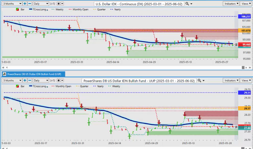 So, let’s dispel that myth that ETFs can’t be used to gauge intermarket correlations in the futures market. As you can see, I have the VP split screen here. I have the UUP—the ETF and the dollar bull fund—and I’m measuring that up against the U.S. dollar futures contract. We can assess here that both are below their calendar yearly opening price, their quarterly opening price, slightly above the monthly opening price, but both are below the T-cross long.