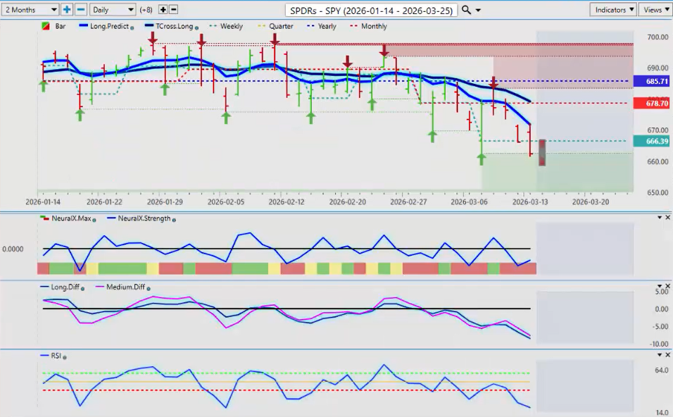 Now the equity markets, most of them other than maybe the UK index, are doing very, very poorly with the Iran US war. Obviously that’s putting downward pressure on the SPY, the Russell, and even the DAX. So the way we would look at this, guys, is again identify the primary trend. We’re below the yearly opening price, the T-Cross Long, and the long predictive. So we’re going to need a bit of a turnaround with this war to get things settled down here, but it doesn’t look like that’s going to be next week. So always remember your retracement points. The T-Cross Long, that’s 671. The T-Cross Long 679. The T-Cross Long 671. We would apply the same values to the Russell.