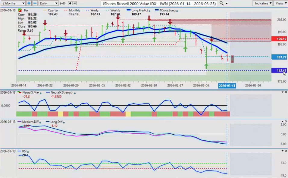 Now the Russell, particularly I’ll point out the IWN on the ETF side, remains above its yearly opening price. The Russell futures have broken down below that. And I just want to point out that I believe, as I’ve discussed on here before, that these ETFs can weed out some false signals. So maybe we’ve got a turnaround coming. The MA diff cross here, the pink line over the blue line, has crossed to the upside. That is a big warning sign of a retracement coming. And those two levels again, the long predicted 189, T-Cross Long 1934.