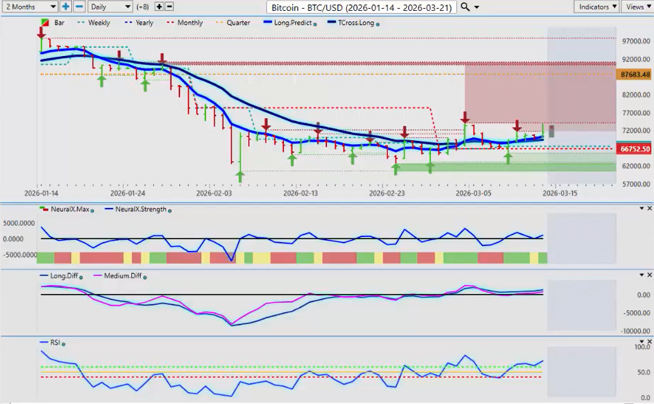 So right now we are starting to form a stronger buy signal. Now again what I will warn everybody is that at the end of the month that doesn’t mean that Bitcoin is going to remain to the upside. In fact I don’t think the closer we get to the end of the month that’ll be it for Bitcoin again. But for now we’re above the monthly opening price. T-Cross Long 69,338 and our long predicted at 70,230.