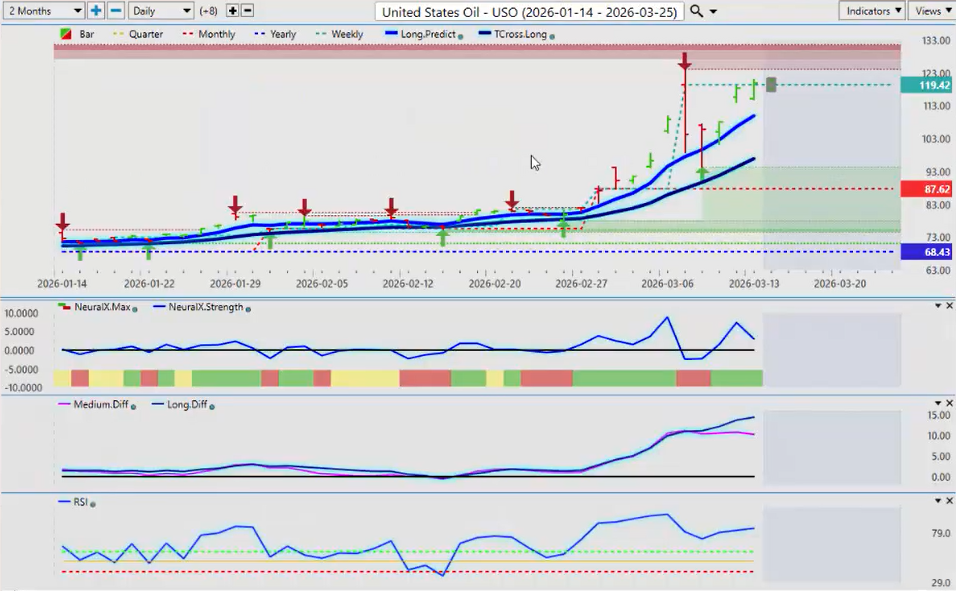 So I imagine that we are still going to extend higher. There’s a lot going on on the weekend right now. Iran striking, the US striking. Who knows where we’ll be on Monday with this? But either way oil is likely to benefit. But I will further point out that we have the MA diff crossed to the downside while the market has continued to advance. We have that divergence of the strength of the medium-term crossover versus the strength of the long-term crossover, and it’s showing that this is weakening actually. So we’ll see how next week pans out. But for now my specific advice would be to be very cautious if you’re trading anything on the energy side, even including silver and gold.