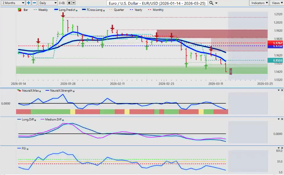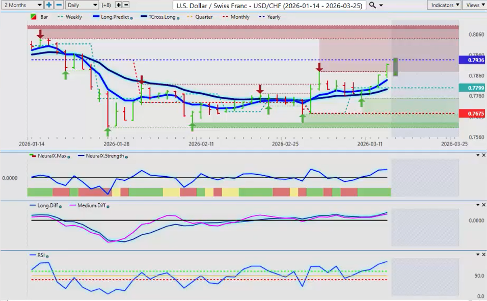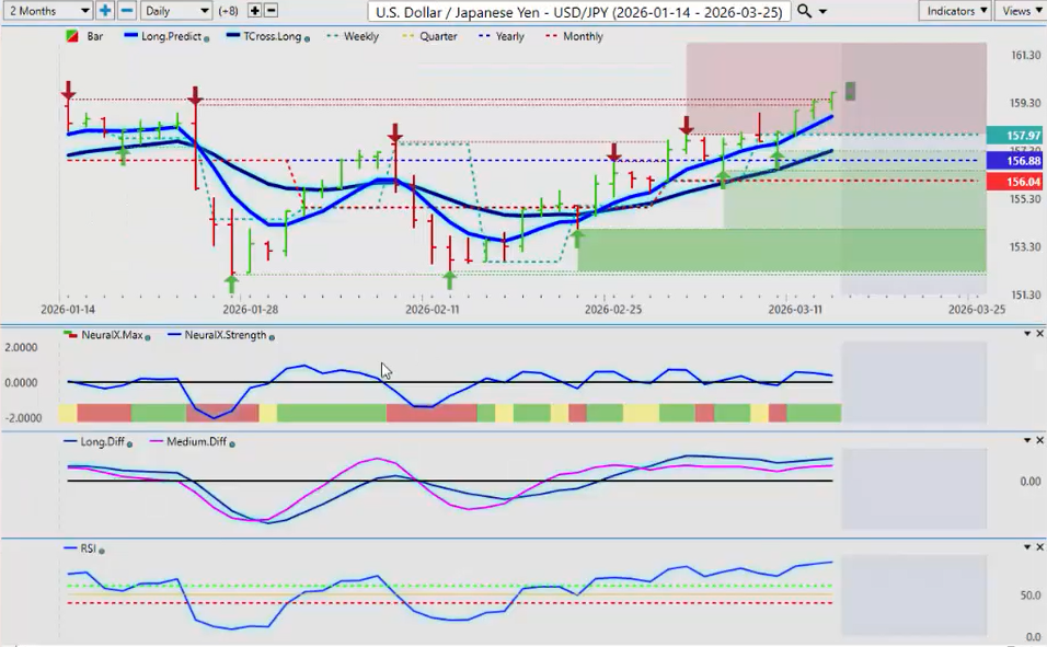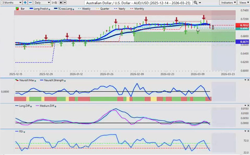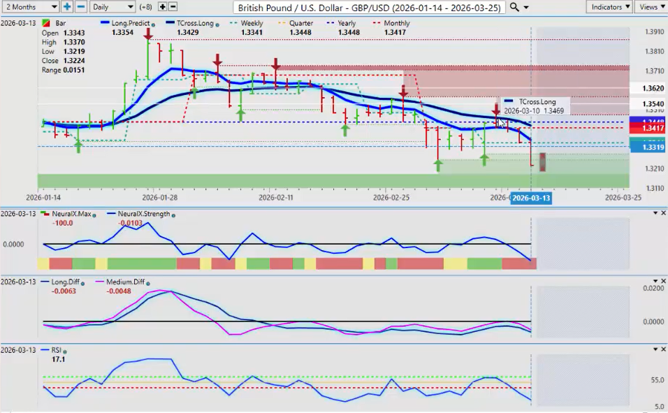 But in my respectful opinion, I think we’ve seen this movie before. Then the dollar remains strong till about 12 noon, 1:00 on Monday, and it reverses again. The MA diff cross from VP is warning of exactly that. So again, when we’re looking at the indicators, yes, we have recovered. We’ve had a retracement back to our T-Cross Long. That is definitely bullish for the dollar. But with all of the things that are going on, if there’s any kind of resolve with the US and Iran and Israel, then this can change very, very quickly. But again, this outlook is for one week only. So going into next week, in most cases when I see a big push to the upside on Friday in ultra thin illiquid markets, we often see the exact opposite at the beginning of the week, Monday or Tuesday of the following week, and that is indirectly supported by the VP crossover.