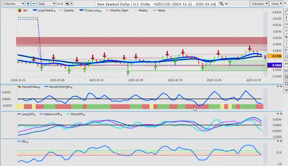 But there again, there is going to be some volatility, but the medium and long-term predicted differences are rising. We’ve got the predicted RSI is rising with it. The neural index, the neural index strength, but there’s a lot of indecision around this one. You can see the long predicted and the T-cross long both at 1.4342, 1.4348. So this one here going forward, uh, easy peasy, guys. If we’re holding above these two numbers, we stay long; if we can’t hold above these two numbers, then there’ll be at least a short-term sell opportunity, and that would be likely down to 1.4167. But my optimism on this pair hitting that level is very guarded, respecting the tariffs, the Canadian election, the policy. There’s a lot of lot; there’s far more negatives on the Canadian dollar than positives. Uh, so again, we’ll see how it plays out, but that is the level to keep your eye on.