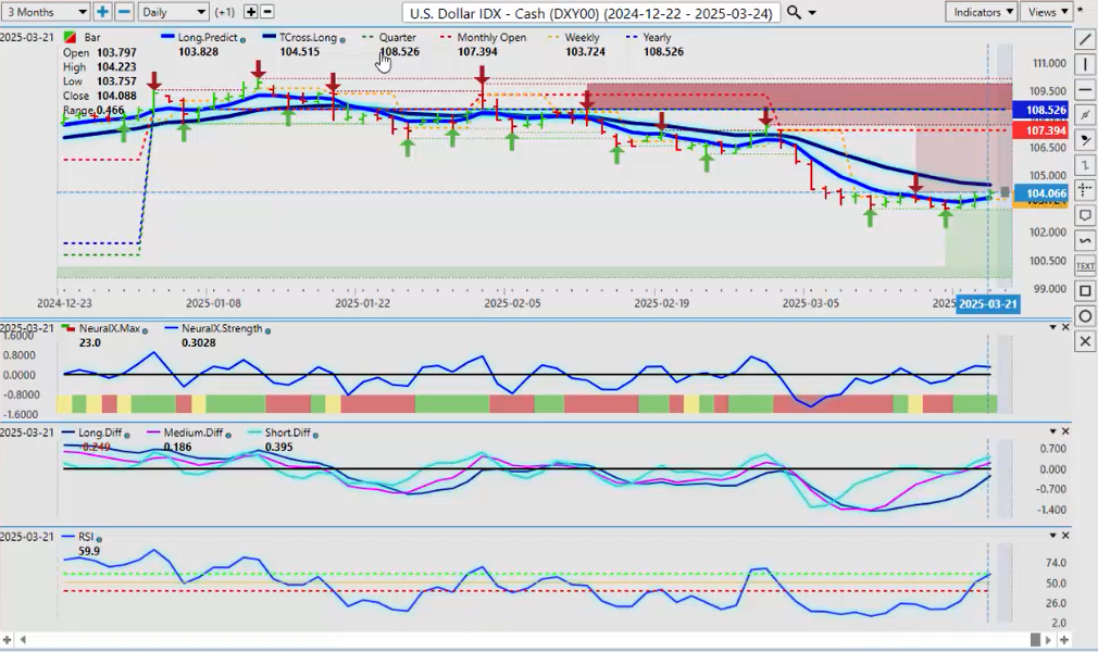 Okay, hello, hello everyone, and welcome back. My name is Greg Ferman, and this is the Vantage Point AI Market Outlook for the week of March the 24th, 2025. Now, just a quick reminder, this is a complete market outlook, but individual stocks are done through the secondary Hot Stocks Outlook. But this is not specifically a stock outlook; it’s a broader market outlook. So, we will begin where we always do with the US Dollar Index.