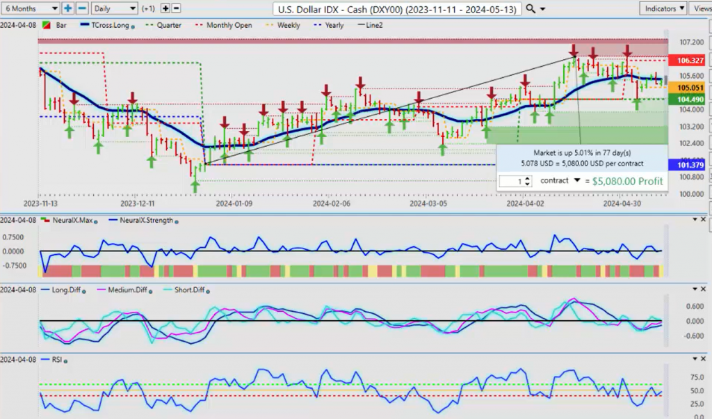 Now, to get started this week, we’ll begin where we usually do with the Dollar Index. We’ll mix things up a little bit so we can see what the actual real performance in 2024 is on the major markets. We can see that the Dollar has hit a maximum of 5% return since January 1st. Using that current yearly opening price is very important in determining what the real trend is from an objective standpoint, not getting caught up in these little macro and micro trends. So right now, the Dollar is holding below the TCross long 10543, but the indicators still suggest the Dollar could have some upside value.