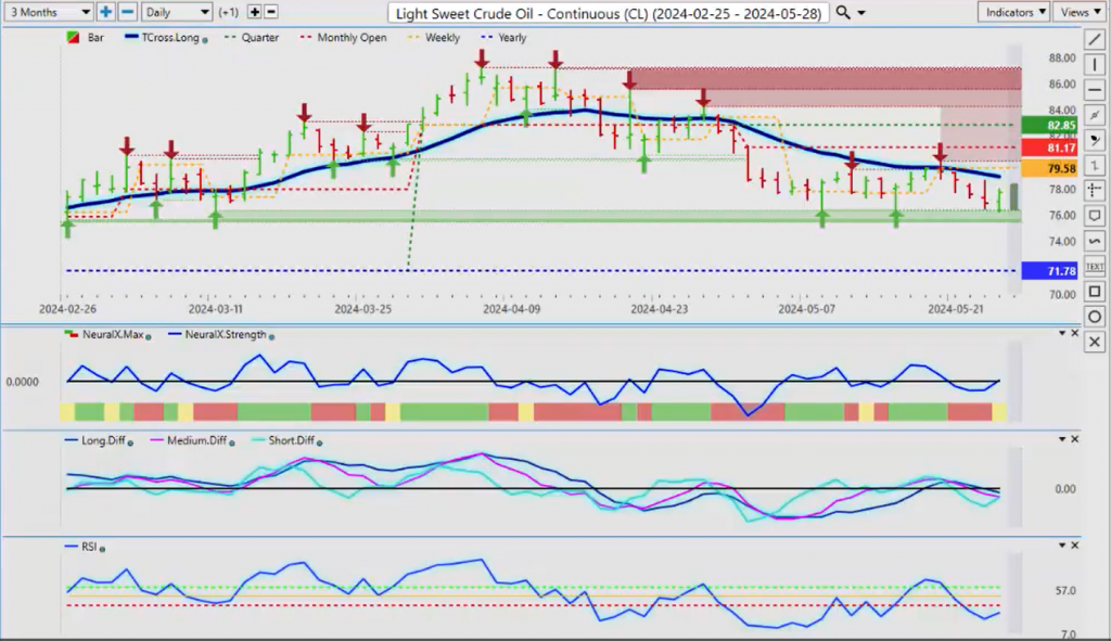 Now, for light sweet crude oil, again, heavy support down here at this 76 level. The seasonal pattern, again, doesn’t really favor gold, but it does favor oil as we move into June, July, August—those summer driving seasons. So, for now, pretty identifiable support. If we come back three months, we can get another multiple hard bottom here. Once again, the bull argument would be that we have heavy support, but the indicators are not overly positive here, other than the predicted RSI and the neural index strength giving that yellow warning sign. But very, very heavy support.