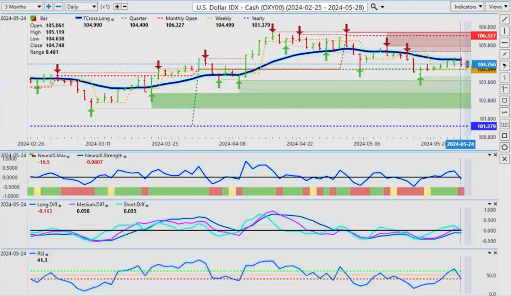 I always try to give something to the bulls and the bears. Your bear argument here is the Fed is going to have to cut in 2024, in my view. But you’ve got other Fed panel members that are saying the opposite, again causing the volatility in the markets. But we are firmly below our monthly opening price at 106.32, and yes, we could break through this particular area. But remember, we have that period of dollar strength at the very end of the month into the first week of the new month, which is actually next week. So the probability of this T cross long breaking is higher because of the time of month we’re in. This cyclical pattern occurs almost every single month here. I’ve talked about it; I’ve coined it the dollar cycle. When real money must buy dollars, they don’t have an option. This could be US governments funding unfunded liabilities; they need to, you know, pensioners, government employees, but they require dollars. Even locally here where I’m domiciled, in Canada, we tend to run out of US dollars at our banks at the beginning of each month. So I would be prepared for some type of dollar strength next week. That is entirely possible.