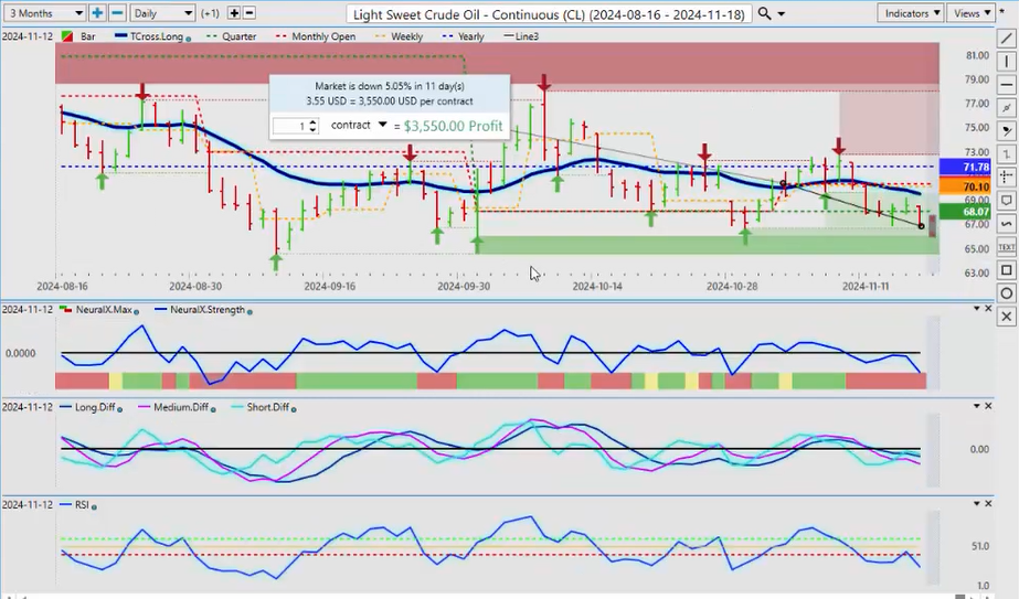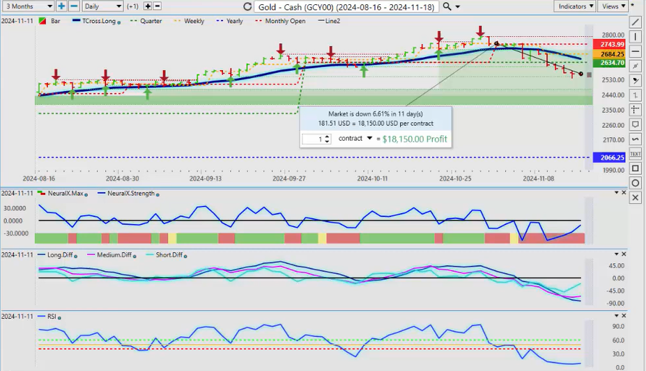 Now, when we measure that directly against Gold, you can see that Gold is down 6.61%, still firmly above its yearly opening price at 2066. And, I would argue, 90% of the time, guys, Gold goes up in the month of December, so I would not count Gold out just yet. So again, another contrarian buy signal here, the MA Diff Cross we’ve been sitting in. Again, this is why we have to be very, very cautious when we talk about overbought and oversold. The predicted RSI has been oversold since the market started moving, but again, as you can see, this breakdown using the current monthly opening price, you can see four days in a row we’re hitting into that monthly opening price at 2743. We come down, retrace back to it, and then the real move shows itself. But, to be clear, guys, Gold is still bullish while above 2066. We’re still positive on the calendar year. We need to get further information from the Fed, but I believe he will have to cut considerably in 2025. But now, you could have, with some of the new policies coming in, you could have inflationary pressures which again could support a higher dollar. So, we do need to be cautious here, but in the month of December, usually, that is when Gold makes its move on a weaker dollar. But this year, I will concede, could be very different now that the election, for the most part, is completely finished, with the Republicans making a clean sweep of just about everything.