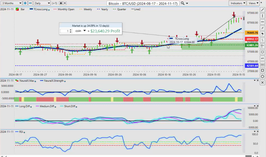 Now, once again, the top performer indisputably here is Bitcoin. Again, as I’ve discussed since these webinars since the end of August, beginning of September, that there are known patterns with Bitcoin in October and November. So, we made a big push up 34.9% on the month here. Now, we have a newly formed verified resistance high at 93,331. So, once again, the question will be, can we break through that? And we very quickly, this past week, took out that 80 and 90,000 mark. Can we get above that psychological 100,000 mark? Well, the MA Diff Cross here is suggesting that we’re going to have a corrective move first. Now, once again, we use those predicted moving averages as pivot levels, our T cross long, 80,674. If we click on our F8 in the software, you can see how the market is in constant contact with this blue line. We don’t need to wait for a crossover here, guys. We can use the predicted moving average by itself and pick up longs or shorts on that area, so that particular immediate support level would come in at 88,259. I will respectfully submit that if we can hold above that level, then the 100,000 mark or a break of that level is still within reach. So again, you’re going to get some traders caught long, some traders caught short, but the pattern, the three-year pattern in Bitcoin, remains fully intact, meaning that next year is likely to be a very strong up. Also, then 2026, we start to run into problems, or a naturally occurring substantial corrective move where Bitcoin could be down 20, 30, 40%, but in the current environment, there’s a stronger argument for a clean break of the 100,000 mark.
