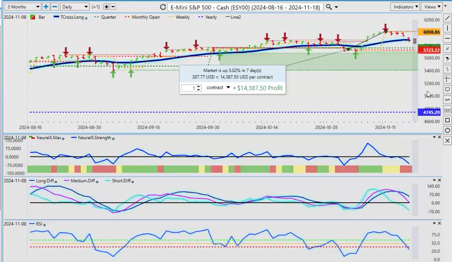 Now, when we look at the S&P 500, for again the true performance on the month here, guys, we can’t shift where we pick our performance measurement from random days; we want to know exactly what is going on in the month of November. So we’ve been up 5%. We’ve retraced back to the T cross long. We don’t quite yet have a crossover on the medium-term crossover; the long-term is quite a ways from that. But again, showing you the power of that MA Diff Cross when you combine it with a verified resistance zone, that area high at 6017, now in this particular environment, it is entirely possible that the equities and the dollar can go up at the same time as money moves into the US, the bond markets, everything else. So again, I’ll monitor this over the next several months, but for now, pressure is building on the downside, but I believe the stock markets will recover on this despite a stronger dollar. The T cross long, 58.82, that’s the area to keep your eye on. If we can get back above that by Tuesday and hold above that, it will confirm the short- or medium-term contrarian sell signal on that US Dollar Index, and then we may see some Gold come to life to some degree.