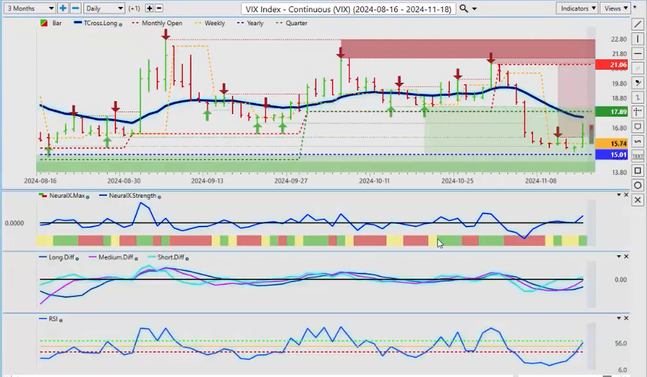 Now, when we look at the VIX here, the VIX continues. You can see once again, guys, this is the benefit of understanding proper anchor points. We don’t want to measure performance on the VIX using a random 30 days, 60 days, 90 days. We want to know where we are on the year. The VIX is bouncing off this area, and we’ve had a fairly substantial rally on the VIX on Friday. So, once again, when they’re telling you the VIX is bearish, in actual fact, it’s not. When we look at the MA Diff Cross, and we combine that with the current calendar yearly opening price at 15.01, we have a very good structure in the market, and we ignore conventional tools and say, ‘Well, they’re saying it’s bearish, but how could that be if I bought it on January 1st? I’m, this is still profitable.’ So, if it’s truly bearish, we’ll have a complete breakdown below the current yearly opening price, and that will tell us that the market is bullish on stocks and bearish on the VIX. They are not saying that right now. So again, we’ll continue to monitor this, but that MA Diff Cross is very important to watch because that will get you into a trade very quickly. Okay, so again, once if we look at that with a conventional blue line crossing the black line, it’s a great trade down, and you can see we had an MA Diff Cross here too that was several days before that crossover took place. Right now, the blue line has not crossed the black line, but the neural index strength, the MA Diff, we’ve got rising momentum to the upside. So that tells us we’ve got a little bit more downside on the stock market before we figure if we want to stay in the long on the equities. But if the US Economy is booming like they’re telling us it is, then stocks should be the place to be.