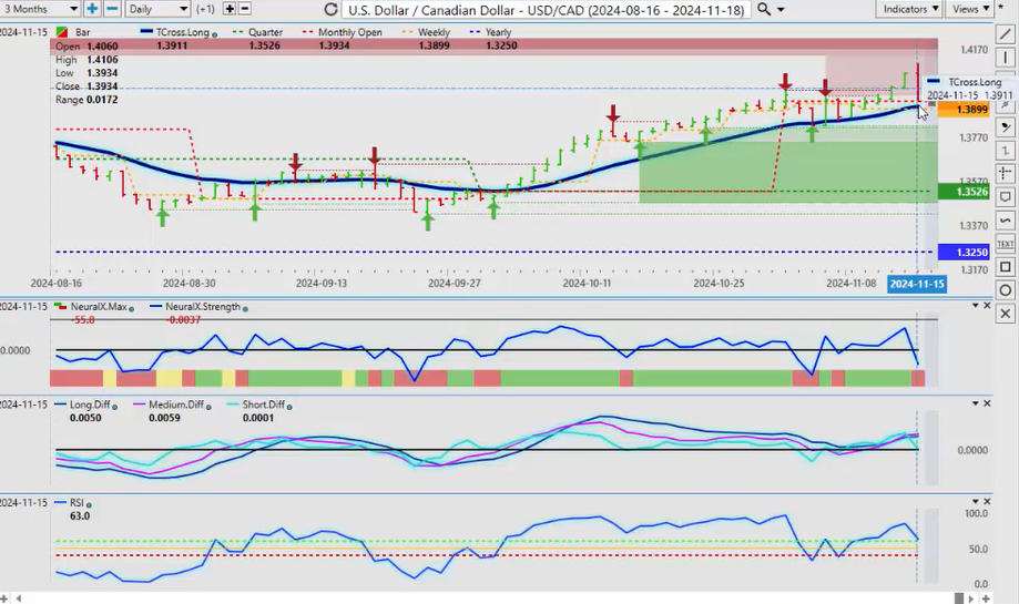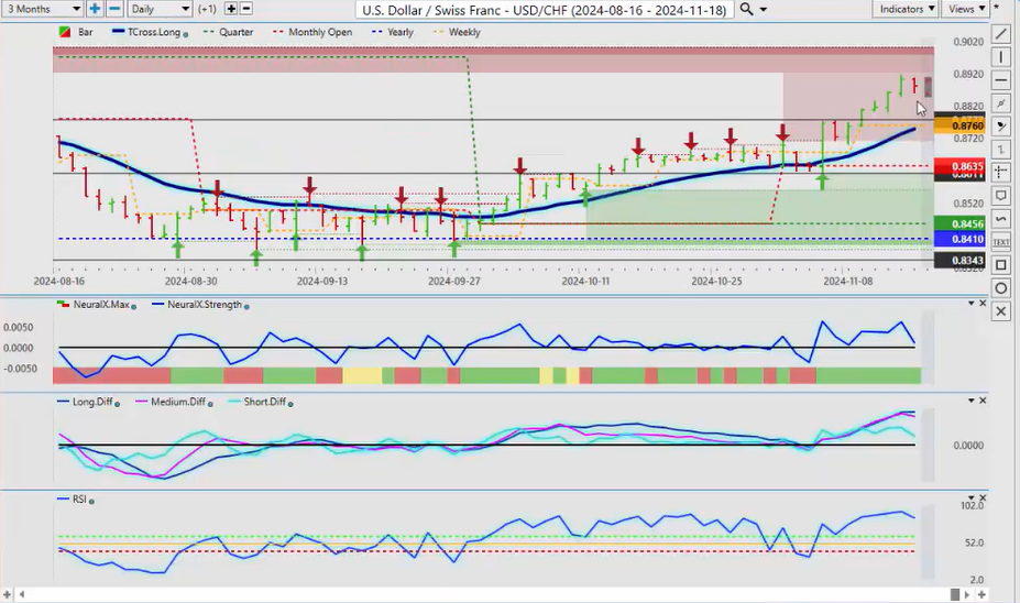 Now, when we look at the US Swiss Franc, once again, the US Swiss Franc is an interesting pair because it also counts as a safe haven currency. So when I’m looking at it now, I’ve got a pushup, and then maybe a little bit of profit-taking on Friday. That’s entirely possible, so the high there is 0.8918. Even if the dollar is very, very strong, it’s possible the Swiss Franc can be also. So right now, once again, another MA Diff Cross to the downside, the predicted RSI heavily overbought territory. But again, we need tools like the MA Diff Cross that are contrarian, that are telling us, ‘Look, the market’s going up, but something internally, based on the correlation to 31 other markets, are not.’ So that doesn’t mean that it will absolutely go lower, but a corrective move, pick your corrective points, guys. T cross long, 0.8749. Click on your F8, and you have your long predicted, that’s coming in at 0.8839. We know if you’re going to buy, then you want to buy between these two levels. Now, I will say for Monday, the predicted low here is at 0.8849, the long predicted is 0.8839, so that connects the dots to a predicted moving average and the predicted high and low of the day. There isn’t a significant gap between those, so it simplifies the entry process and says, ‘Okay, I think I can put it right in there, and then I can have my stop-outs or underneath the T cross long, or I can buy between the long predicted and the T cross long.’ But it gives us that area with a warning sign with the MA Diff Cross suggesting, yes, we are going to likely come lower. I suspect if that does come lower, it’s not going to be Monday; it’ll be Monday after 10 a.m. or will be Tuesday, Wednesday.