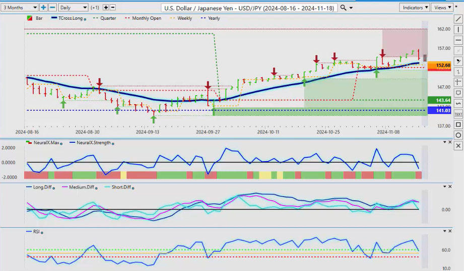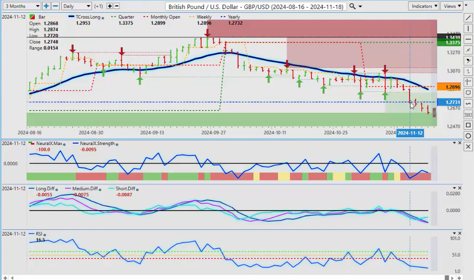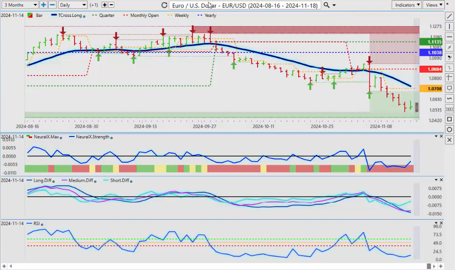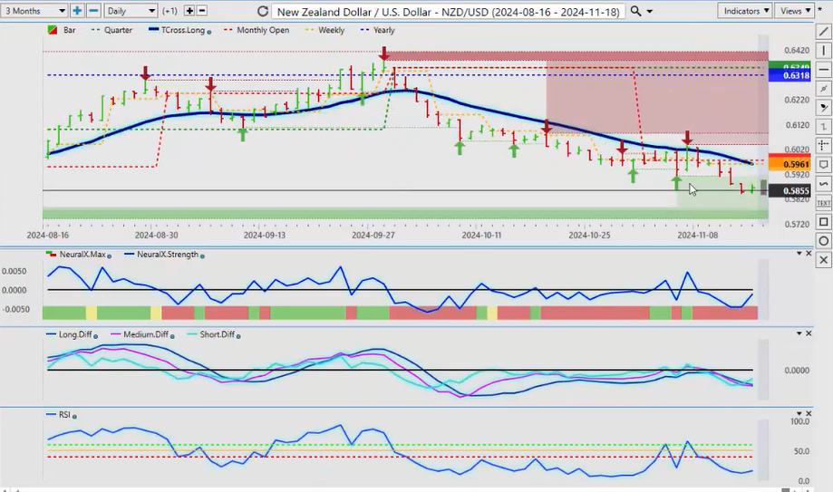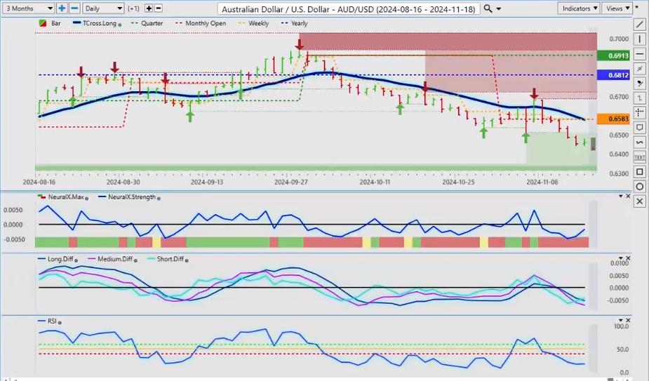 Now the Aussie US and the Kiwi, a very similar trade to the Canadian Dollar trade. We are going to need the equities moving higher, some of your metals, we need more of a risk-on environment to get the Aussie moving again. But for now, as you can see, the structural bias over a 2-year period is going to look very similar to the Euro US pair. So right now, you can see this longer-term channel. Is it possible we could get back down to 63? Well, it is possible, but I think for now, the immediate verified low is coming at 64.73. So, keep an eye on that area next week. If the dollar stumbles a bit or there’s a corrective move on the dollar, profit-taking, then that would send this back up on a shorter-term basis, maybe for a couple of weeks. But we shall see. So right now, again, we look for any kind of contrarian signal. We don’t have it right now. The MA Diff Cross was deadly accurate yet again as it got all tangled up in the TR cross long. Now again, using a single predicted moving average, it removes any kind of lag out of the market. It basically allows us to see how the market is reacting to that predicted moving average and the correlation to 31 other markets. That’s the whole concept behind this, guys. Right, so I often have a two-day rule; it’s got to get close above the TR cross long 2 days in a row in order for me to say, ‘Okay, we’ve got a trend.’ But I also want to be able to identify the primary trend using the quarterly opening and the yearly opening, and even the monthly opening. And this trend is down; there is no question about it. So, that single close above here, uh, the very next day, we are closing right back down again. But understanding the structure of this can be very, very helpful to new and old traders alike. Uh, it’s never too old to learn something different and apply it because, again, we always want to stay current. If you’re looking at, you know, every month we have new CPI, new PPI, new Fed, new Bank of Australia, we have all these things that occur every 30 days, they reoccur every quarter, they actually reoccur every year. So we want to know where we are in that, and you have banking transactions that occur in November that don’t occur in October. That’s why isolating the month is extremely helpful.
