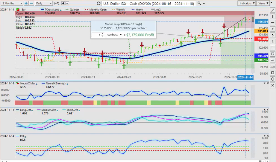 Okay, hello everyone, and welcome back. My name is Greg Firman, and this is the Vantage Point AI Market Outlook for the week of November 18th, 2024. Now, to get started this week, we’ll begin where we always do with that very important US Dollar Index. What we can assess, or what I can assess here, is the true performance. We always measure from the beginning of each new month, each new week, each new quarter, each new year, so we get an accurate measurement of performance. The dollar is up 3.06% in just 10 days.