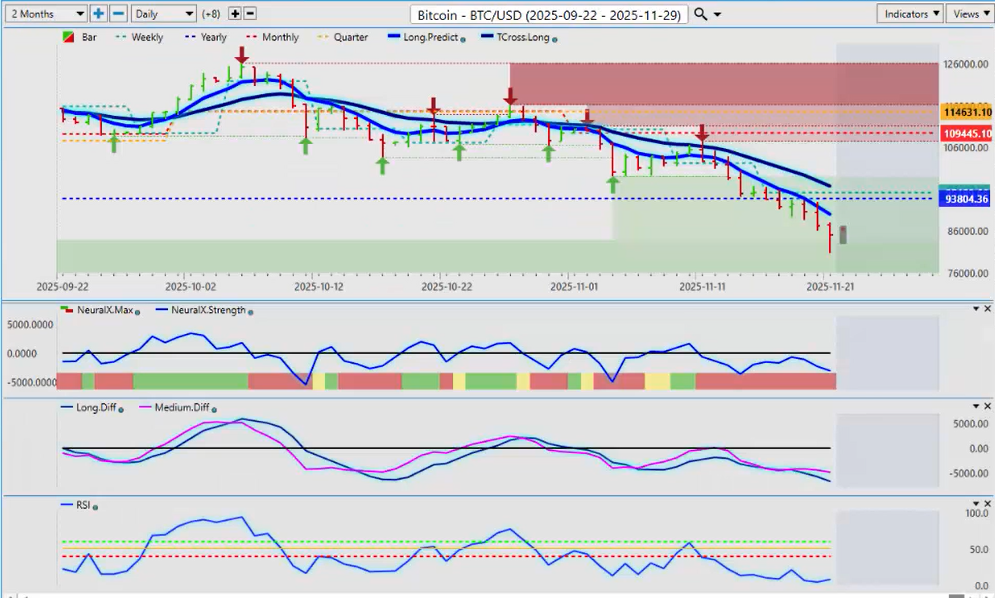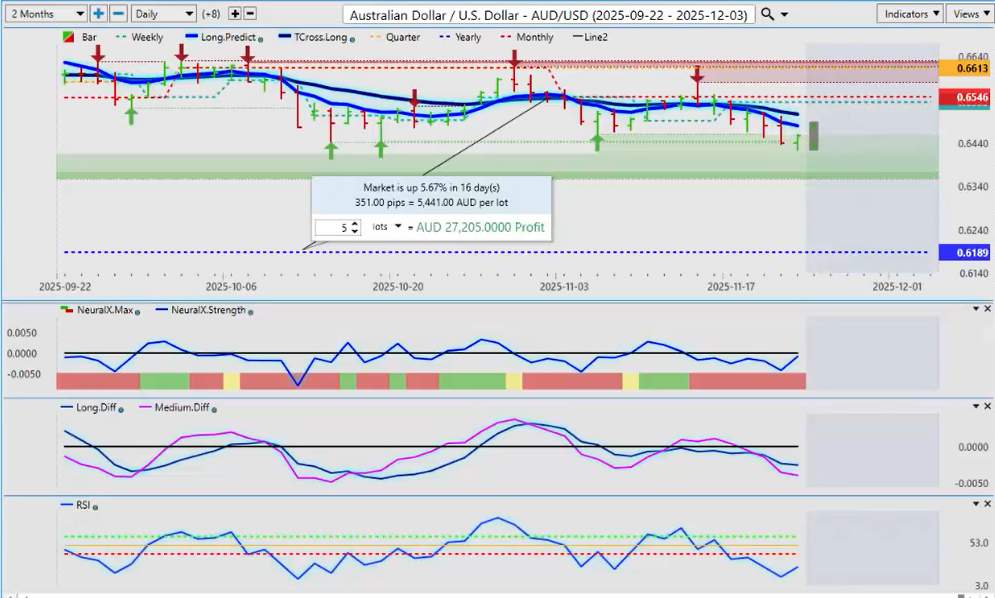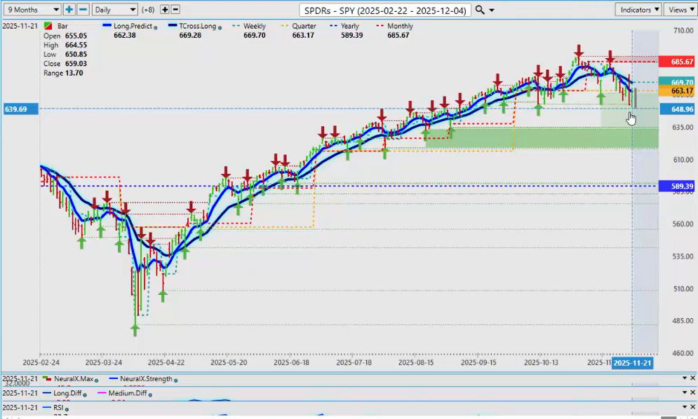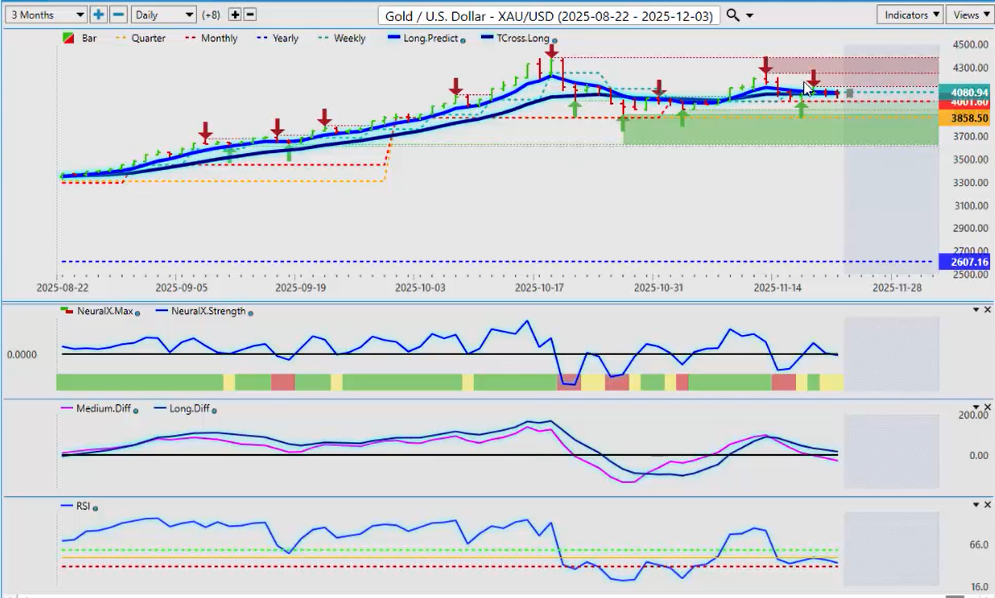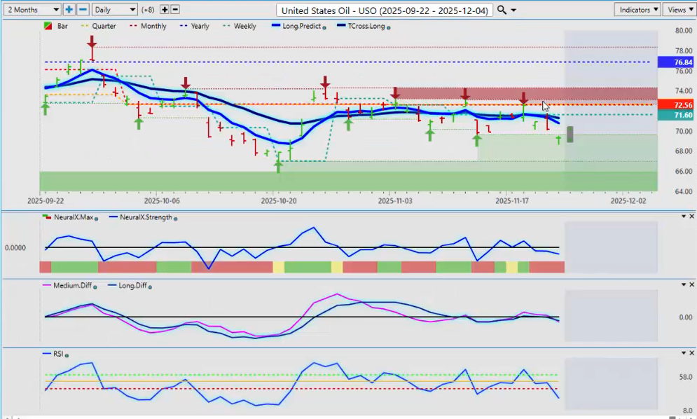 A lot of confusion exists around the Fed. The Nvidia (NVDA) earnings were very good. The CEO of Nvidia said, “I don’t believe that there’s a tech bubble here or an A.I. bubble.” The market still pushed it lower, but anything around U.S. Thanksgiving often sees this kind of volatility, which I would’ve expected next week. The market is very jittery. Based on this, I’d be looking for some type of continuation into next week, provided the Fed stays in check. Looking closely at the chart, we see a big move down—a big bar down—and then a reversal. The Neural Index in my respectful opinion, and the Neural Index Strength, were already giving a warning sign that this market was not as structurally weak as it looked. What we want to see now is a move back above the quarterly opening price and ultimately above the T-Cross Long at 66.928.