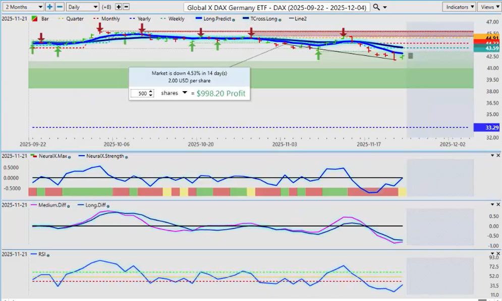 Japan’s exports are doing well, but imports are costing a fortune with a yen this weak. VantagePoint is picking up on what I’m thinking: the MA Diff has crossed to the downside; the Neural Index is pointing down; the Predicted RSI is pointing down; and we are failing at the yearly opening price. If there is going to be intervention to strengthen the yen, we could be days away. If you’re not sure, stay away. It’s going to be volatile into the end of the calendar year. I’m getting the feeling that Japan is getting ready to make a move very soon. Be very careful.