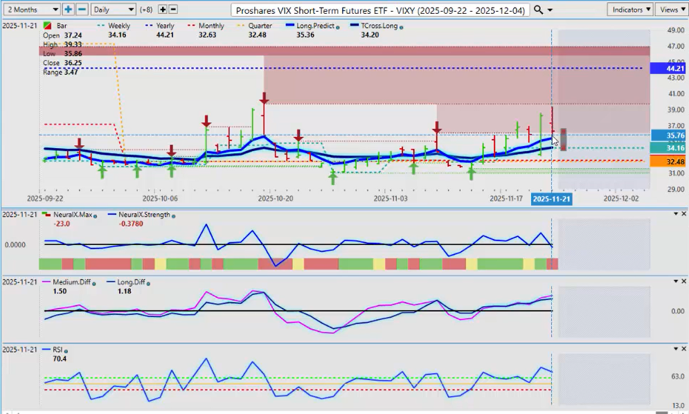 The VIX is holding above the quarterly opening price but is still negative on the year. This is being missed in the media because they are consumed by short-term trading. If we look at how the VIX finished Friday from the yearly opening price, it’s down 17.85%. I would need the VIX, at the very least, to stay above the Long Predicted and the T-Cross Long, but there are already cracks in the dam. Much will come down to what the Fed does. Over the last 5, 10, 15 years, whether the Fed hiked or cut, whether he was hawkish or dovish, equities have ultimately gone higher. The VIX is still grossly negative on the calendar year on this ETF, but it is something we need to keep an eye on. I believe the Fed is going to discuss rate cuts in 2026 and will likely cut, but the U.S. economy is moving along pretty well by the numbers despite tariffs and everything else.
