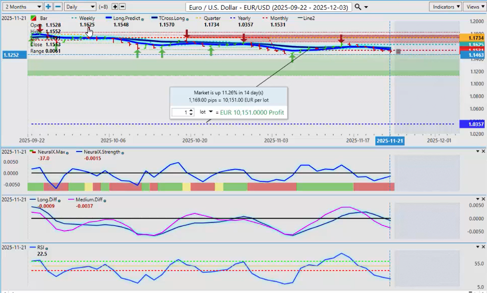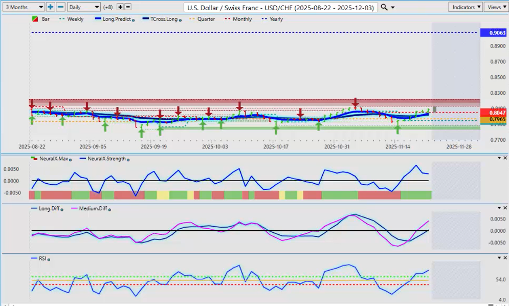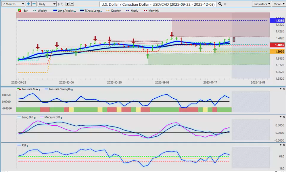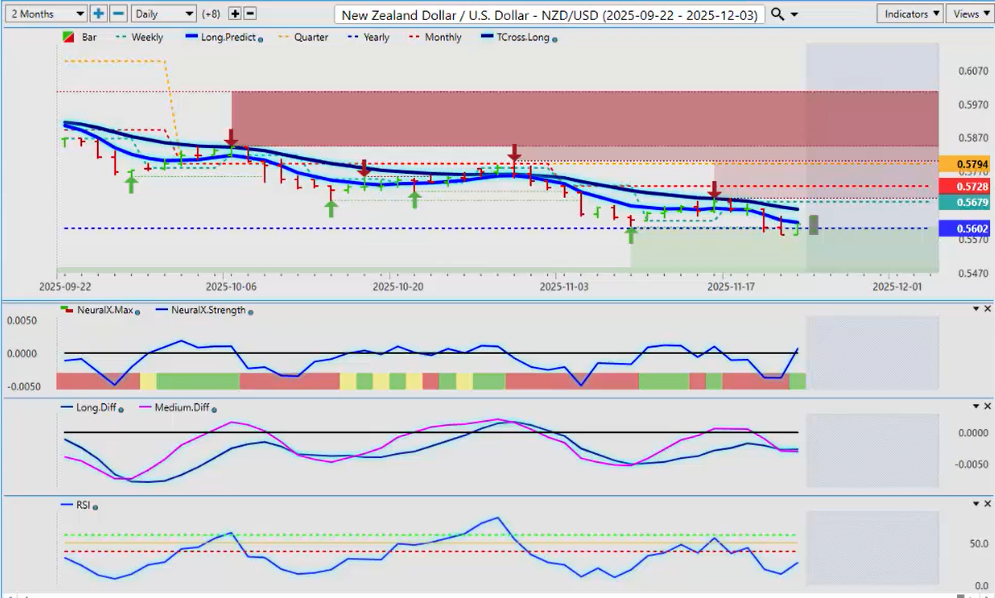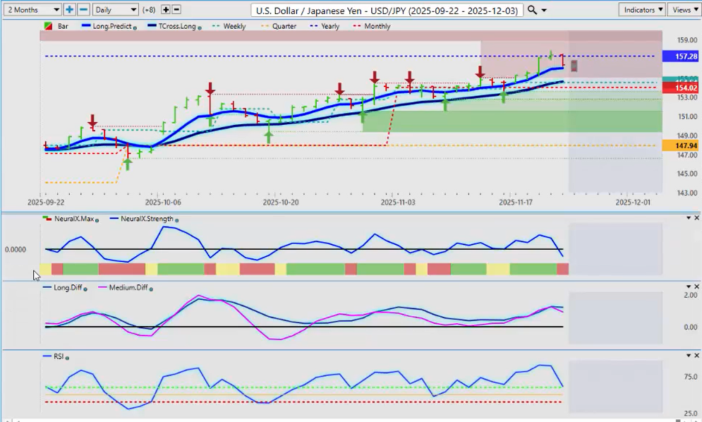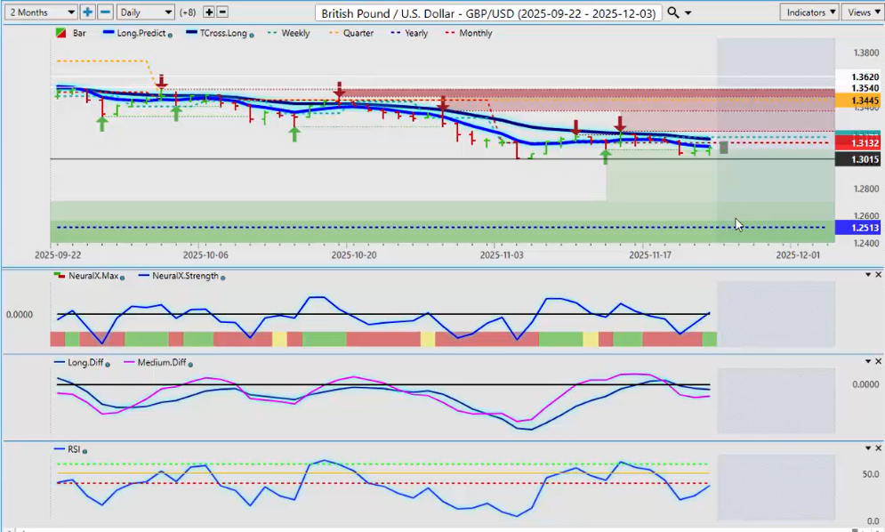 I am seeing a warning sign with Neural Index Strength starting to turn. The Neural Index is red, but inside that index it looks like it’s trying to turn around. Watch this area very closely around the Monthly Opening Price at 1.1531. If we can hold above that next week, then I believe you have a long trade here, and we’ll be watching this into December.