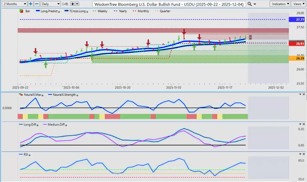 Okay, hello everyone, and welcome back. My name is Greg Ferman, and this is the VantagePoint A.I. Market Outlook for the week of November 24th, 2025. Now, to get started this week, we’ll begin where we always do with that very important Dollar Index, or in this particular case, we’re looking at the USDU (Bloomberg U.S. Dollar Bull Fund) to measure this dollar strength. We’ve been running along the T-Cross Long for basically about two weeks now, and we’re starting to rise higher. Bets are mixed on whether the Fed’s going to cut or whether he’s not going to cut, but quite frankly, guys, at this point, it’s really just a lot of noise in the market and a lot of confusion, and that’s coming from the Fed members.