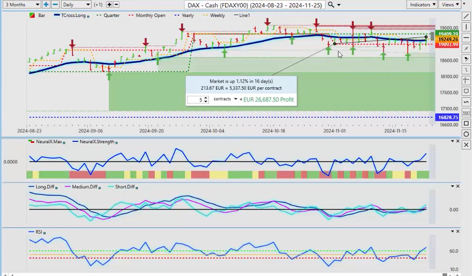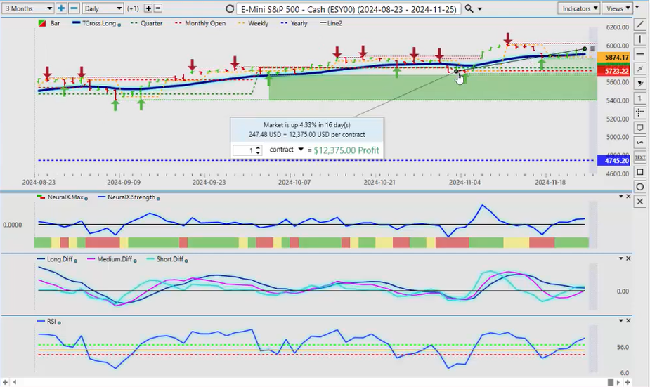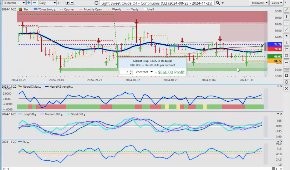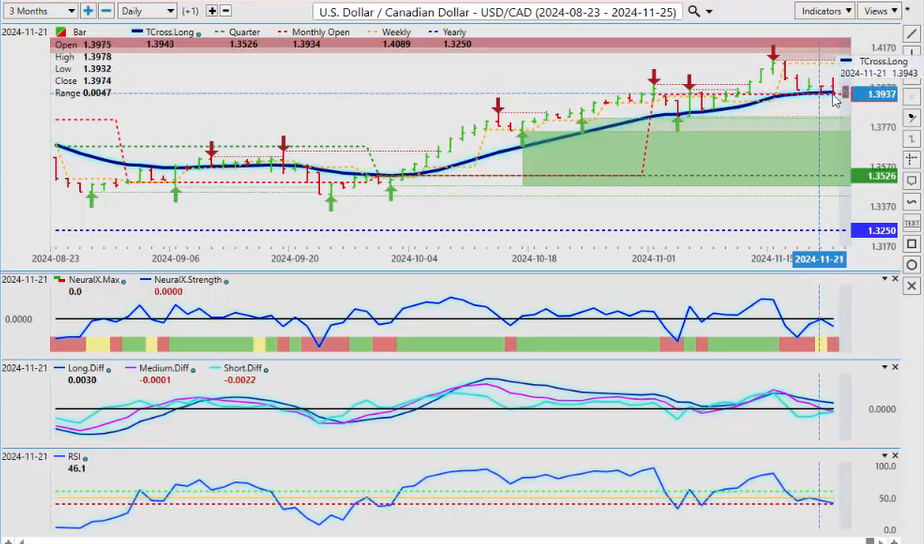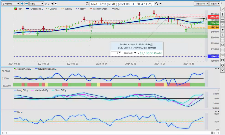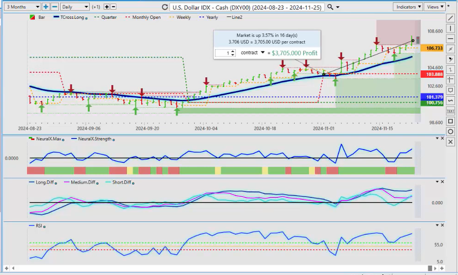 Okay, hello everyone, and welcome back. My name is Greg Firman, and this is the Vantage Point AI Market Outlook for the week of November the 25th, 2024. Now, to get started this week, we’ll begin where we always do with that very important US Dollar Index. Now, once again, a significant move to the upside this particular month: 3.57%. Now, once again, here guys, we don’t want to be looking at what the market’s done in the last random 5 days or random 30 days; you’re not going to get a true measurement of the performance in that particular month. This would also apply to seasonal patterns and things of that nature. So when we look at that, we want to know exactly what the performance is, using the first day of the month. So, a 3.57% rally in the dollar is a very strong rally, for a currency, to say the least.
