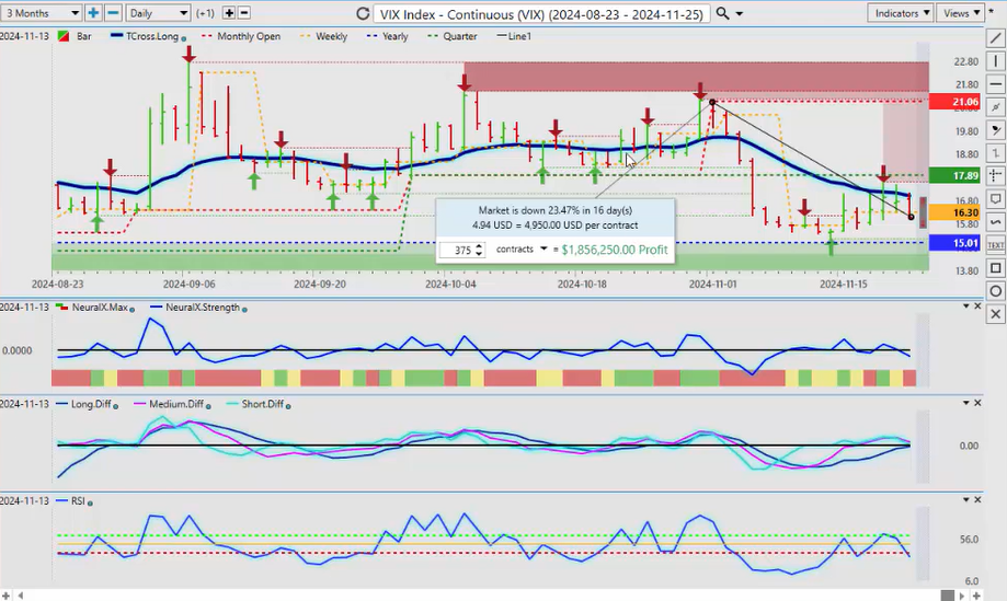 Now, when we look at the comparative analysis to the VIX, once again, this is very, very interesting here, guys. We’re down 23.47% in the month of November. Again, I’m not going to go 30 days and say the 30-day performance from the 22nd of the month; that doesn’t make sense. That rolling performance would be very misleading. You could one could say, oh, well, it’s super bullish or something, right? Because you’ve got your anchor points wrong. So, right now, I believe that prior to the US election, they were buying both the VIX and the equity markets, and they clearly dumped out of the VIX long trades once we, surprisingly, that the Republicans had a clean sweep, the house, the Senate, it’s not just about the presidency, guys, it was about who controls Congress here. So, that now, they’ve put their bets on the equity markets, and they’re pulling other their Longs on the VIX. That’s my opinion only, but it answers why you’ve had such a volatile move. They don’t need to hedge; they feel, not saying they’re right, I’m just saying they feel they no longer need to hedge their bet. Now, they’re all in on the stock side. They exit the VIX.