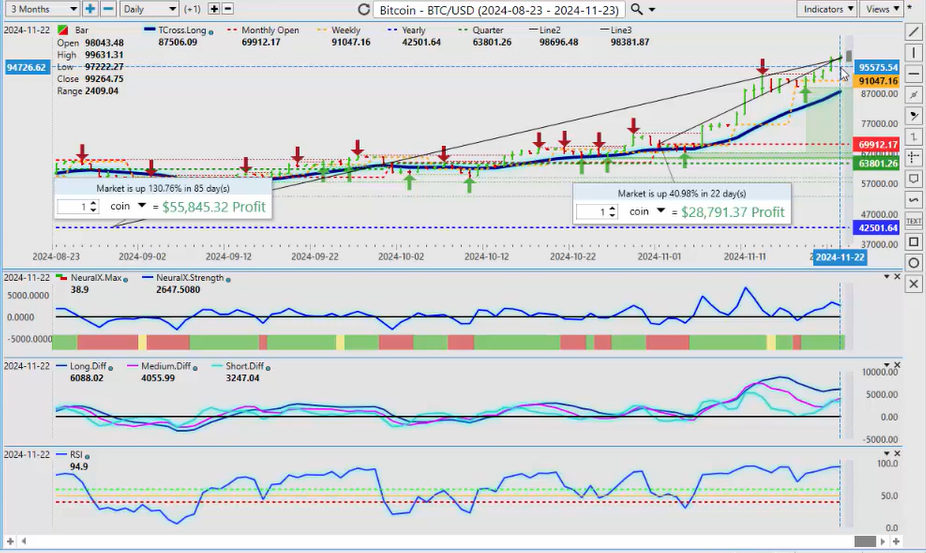 Now, with Bitcoin here, Bitcoin, I haven’t looked at it this weekend; we’re sitting right on the cusp here, in my respectful opinion only. If the 100,000 Mark goes down on Bitcoin, which is extremely likely, I would suggest that there could be a significant amount of short covering, which could very quickly push Bitcoin to one 20, maybe even 130. If it doesn’t break 100, and we stay below it, well, that could have some of your Longs taking profit here. But once again, we are a little bit overextended, but that has had zero effect because if you look at conventional indicators, overbought, oversold, accumulation distribution, this type of indicator can very often get you in or out too early. And when you right now, this is why we use these VP predicted moving averages. So you can see, on the pullback, it’s pulling back to, if you click on F8 in your VP software, that predicted moving average, the market has been in contact with it every day last week, guys, and that’s when it’s okay to buy high. Am I a big fan of buying high and selling low? Not really, no, but if the conditions and if the technicals, the intermarkets, and all of these things come together, and I have a good support level to buy from, and it’s holding, then yes, I’m fine with buying high because it’s a momentum-based market. That is, in my respectful opinion, what is happening here. You’ve got people that are coming in that have missed the rally that are trying to get in. You’ve got people that are already long, were concerned that they’re going to take profit, then you have a probably a large number of analysts have been very negative on Bitcoin. I’ve been the exact opposite of that for years now, and so if they’re, they’re going to have to cover those shorts, then again, it would likely be sooner rather than later, and it could be the final thing that blows Bitcoin right through the 100,000 Mark. So keep an eye on that one, but a 100K for this coming week is very important.