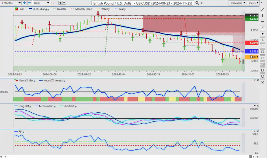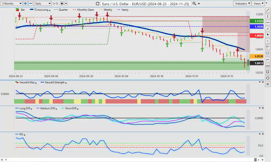 Now, what we do look for here are signs of a potential reversal. We have the MA diff cross that has taken place at the high of 107.10. So, it is possible that this break higher here is a false one, in thin, liquid Friday trading. Because, as you can see, this newly formed verified resistance high contained the dollar for the entire month. But we had a very minor retracement on the Tuesday, I believe it was, and then it started to rally back up again. So, for now, we want to be wary. Usually, going into the month of December is not a great month for the US Dollar; it’s usually a very strong month, mid-November into mid-January, even late January, for Gold. So, our key level, once again, we want to make, because again, this is an outlook, not a recap of something that has already taken place, we want to understand where these key pivot levels are. The T Cross Long: 10572. When we click on the F8 in our VP software, we really get a feel for where the market is retracing each day, which again has absolutely nothing to do with waves, Fibonacci, any of this stuff, guys. The predicted moving average, with the correlation to 31 other markets, somebody is buying on a daily basis. So, until this ends, we should be doing the same, but we should be very, very cautious of an overextended dollar.