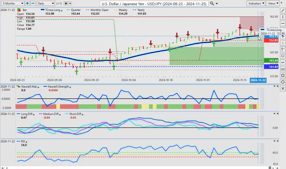 Now, with US Japan pair, is the carry trade back on is the million-dollar question. Well, for now, I would have to argue, it potentially is. And again, with that outcome of the US election, not just who won the presidency, guys, that’s not what it was all about; it was about who gets control of Congress also, and I didn’t think they would win both, but they did. So, right now, the T Cross Long is 15390. When we click on our F8, you can see we’re struggling a little bit around 15483, so if we get above that area, then this pair could extend higher, but I do believe the Bank of Japan is going to be on the prowl, looking to intervene here. So, we know where our key levels are, guys, but once again, the structural bias of this market is very easy for the average and professional trader alike to see if you have the proper anchor points: 14103, 14364, 15203, and then we’ll have a new weekly opening price next week, which will likely come in around 15477. So, if we’re staying above 15477 next week, then the probability is you have a long trade yet again, but I’m sure that the Bank of Japan will be watching this very, very closely. So, be careful with this particular pair.