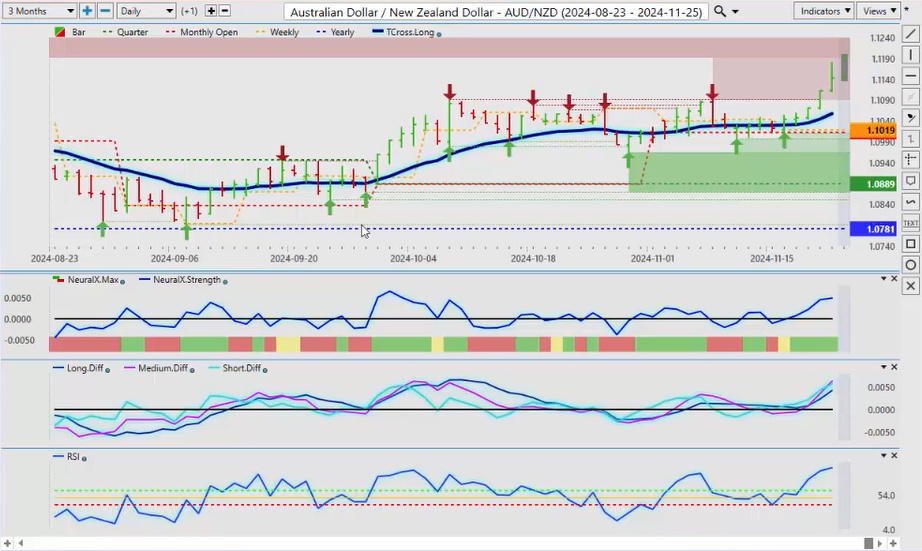 Now, with US Swiss Franc, when we look at it again, some good selling up here around this 89 Mark, but then we, as we retrace back to our Tross long, that T cross long was sitting at 87.64, and it pulled up, but again, if we click on our F8 in the software, you can see that yes, it broke through our long predicted, but it was supported by the Tross long and ultimately rallied back up. So, for your more aggressive traders, you could look at shorts here around 89.50 on Monday, but you would be fighting a strong trend. Ultimately, I believe the Swiss Franc will overtake the dollar again because, again, when you look back, go back over the many years, this pair is usually well above parity, and we haven’t been there for ages. So again, we’ll monitor this, but if the US Dollar Index continues to advance, and it’s not a false break above 107, then US Swiss Franc can go higher.