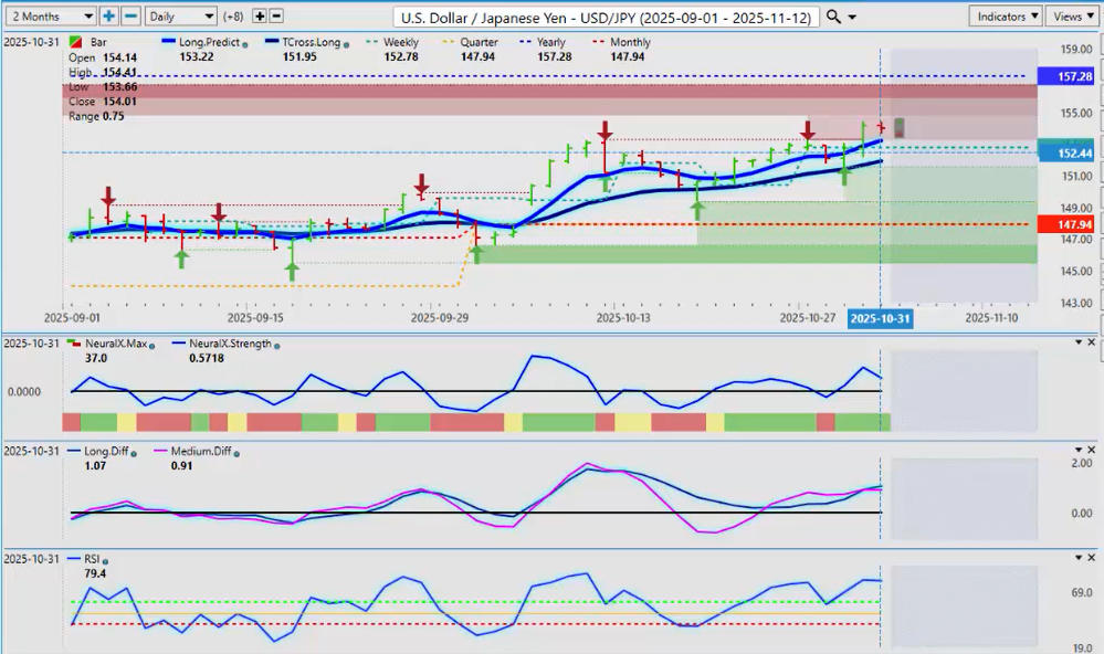 Okay, hello everyone, and welcome back. My name is Greg Ferman, and this is the Vantage Point AI market outlook for the week of November the 3rd, 2025. Now, to get started this week, we’ll begin with that US dollar bull fund. We’ll have a quick look at the UUP and the USDU, both have slightly different signals. Now, when we look at the USDU, which does a very different calculation on the strength of the US dollar, we can assess here that we have another medium-term crossover back to the… another MA diff cross, excuse me, back to the upside, after being unable to break down below the 50 level on the predicted RSI. Our neural index strength is pointing up. Our medium-term predicted difference is above our long-term predicted difference, and again, we remain above the quarterly opening price, and more specifically, the Tross long at 26.72.