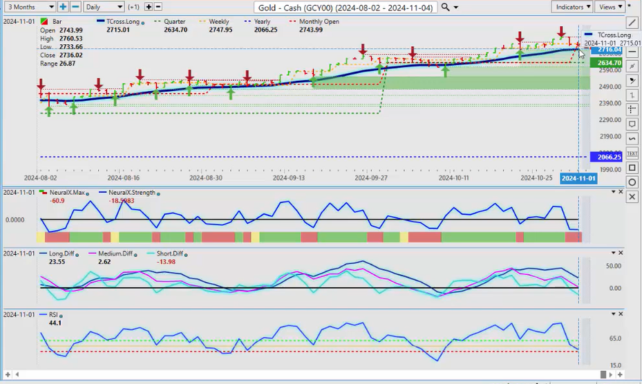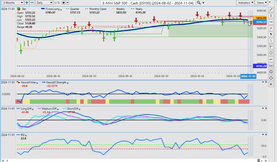 Now looking at the S&P 500, obviously, they’re not responding well, uh, to this election, uh, I think a lot of market participants, uh, are basically hedging their bet, which I’ll talk about more in a minute with the VIX. But when we look at the S&P 500, our T cross long at 5785, so yes, the Fed is likely to cut a quarter basis point, but the equity markets may not, uh, respond the same way they have over the last several years. So again, we’ll monitor these particular levels, but my concern here is we have a considerable gap from where the market is now and the current calendar yearly opening price at 4745. In many years, regardless of how big a move I’ve seen in equities, I’ve also seen, uh, a significant sell-off getting close to the yearly opening price and then rebounding a little bit higher. So with the verified support low, the next low we have here is 5406. That is a considerable distance from where we currently are right now, so some volatility coming into the market.
