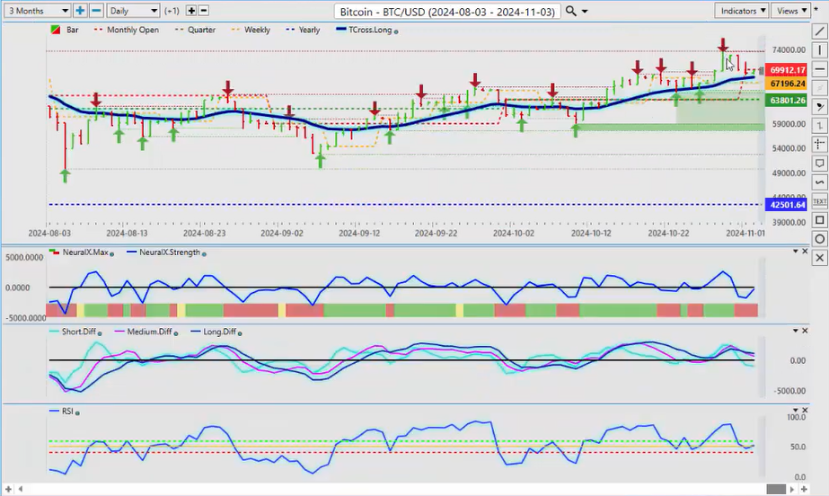 Now, Bitcoin, again, coming off of a very, very strong month, uh, not surprisingly, because again, I’ve talked about that VIX, or, or excuse me, that Bitcoin, uh, considerably over the last period of, I would say, arguably the last, uh, probably two months. Now, looking at Bitcoin here, we can see that Bitcoin is, uh, coming off of its, uh, it’s at a big push at the start of the week, 73,534. We’ve retraced back to our T cross long, the structural bias of Bitcoin remains solid. Now, November is not usually as strong as October, but it still looks good for a retracement higher, but again, the market waiting to see what happens with the Fed, the election, all of these different things, uh, so again, our T cross long, 69,912. On that, but again, when we’re looking at that current monthly opening price coming in at about the same, 69,912, we want to watch this area very closely, as our T cross long, excuse me, is a little bit lower than that, at 68,376. Now we do have a corrective sell signal on Bitcoin, but when we combine that with the predicted RSI, we can assess we don’t have downward momentum, so it’s telling me that basically this is just a simple corrective, uh, profit-taking ahead of some major event risk this coming week, and then we go higher again. If we look at Bitcoin, guys, since about 2014, when you’ve had one year in Bitcoin where it’s down 50% or more, it has rallied for the next three consecutive years. This again occurred back in 2018, same thing, so in 2022, I believe it was, we had the same thing, Bitcoin selling off 60-70%, but we have fully rebounded from that. Last year was the first year of that three-year cycle, being up 155% last year, and we’re up over 60 this year, so in my respectful opinion only, Bitcoin still, uh, has 2025 as a strong rally, and then in 2026, we likely get into potentially another down year. So right now, unless we have momentum breaking on the predicted RSI, longs are still, uh, heavily, heavily favored on the Bitcoin contracts.
