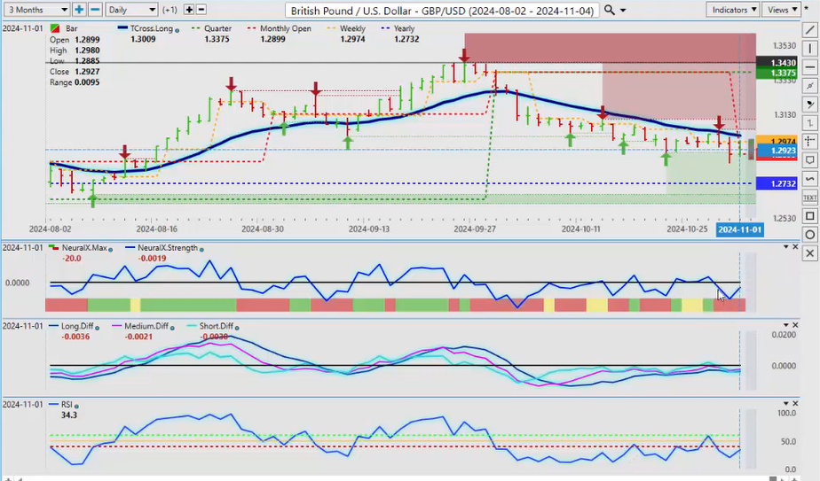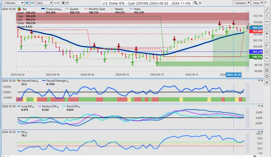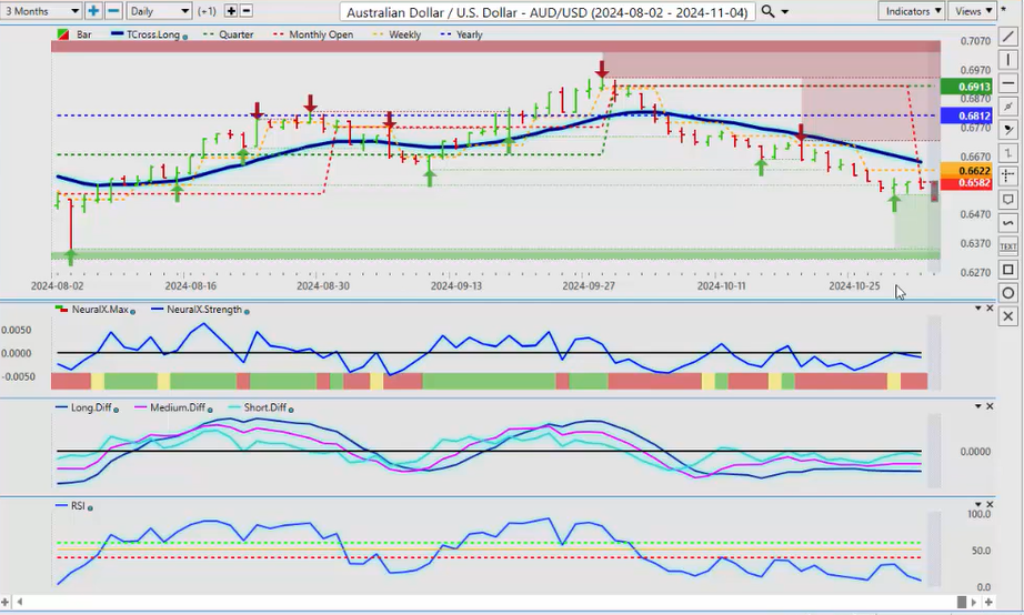 Now with the pound/dollar, again, we are holding above 1.2732, the calendar yearly opening price. Now as long as we’re holding above this level, there is a slight bias for longs here. Now the signal is starting to progress, there’s a checkmark here on the on the neural index strength, so while the neural index is red, it’s important to point out that inside the neural index, the angle is actually pointing up, suggesting that, look, something is going on here. So our TR cross long, 1.309, we need to get above that. Once we do, we should be able to target back into this 1.3430 area into year-end, but again, uh, we will see where we with the data and everything that’s coming out next week. It could be very positive for the dollar, or it could be very negative for the dollar, so we’re all waiting on pins and needles to see the outcome of the election, and in next week’s outlook, uh, I will briefly speak to it and see where we’re at. But again, hopefully, it’s not contested, and we move through this.