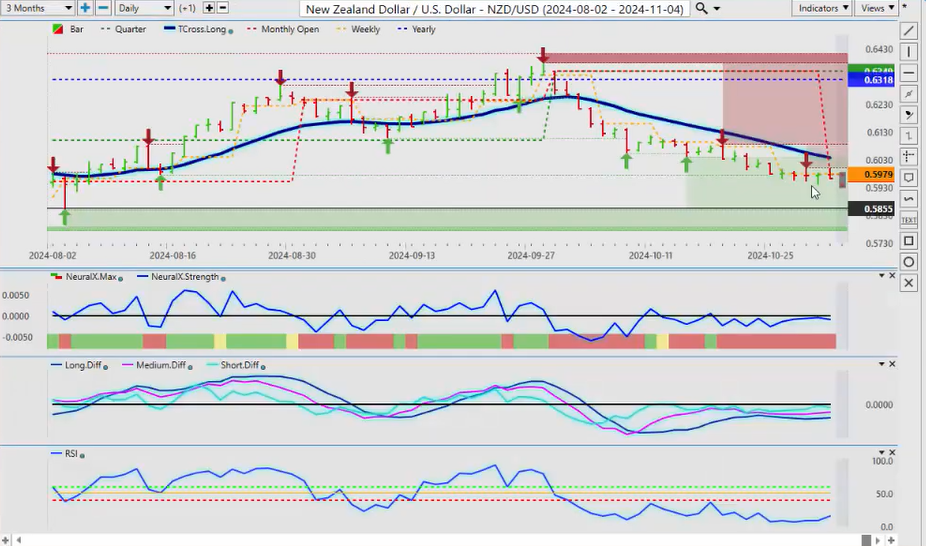 If we look at the Kiwi, we’ve got the same thing here. If I just take this and visually draw a line right there at .5935, we would need to break down below that, but either way, longs are heavily favored if we can get down to .5851, but I will respectfully submit that is unlikely at this time but still possible. So we have a very, very choppy week ahead of us here, but with that will come opportunity. So, with that said, this is the VantagePoint AI Market Outlook for the week of November the 4th, 2024.