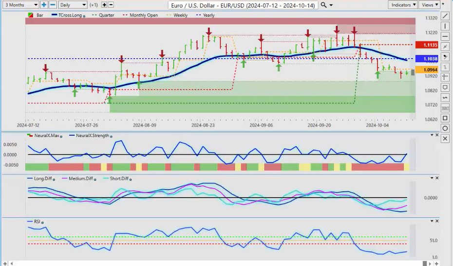 Now, as we look at some of our main Forex, I think most eyes are going to be on the Euro-US pair this week, and that’s with the ECB, but I also believe that that’s, that the whatever the ECB cuts rates, it’s already being worked into the price, and then the Euro rebounds potentially after that, so the Euro likely to see some pressure, but as you can see, that same MA diff cross is warning us, saying look, this trend to the downside is not as strong as what it appears, and using contrarian indicators like this will always get you in front of things instead of lagging behind the moves that are actually already in progress, so it will be up to Lagarde in the ECB, but for now, I would say that the very minimum retracement point is our T cross long at 110.26; if we can get above that, then we could see the Euro rise further, but risk-off scenario, uh, everything that’s going on in the Middle East well’ll continue to uh, see dollar buying this year, maybe a little bit different, we may have to wait till November for that dollar weakness, but it, we’ll see what the ECB does, but in most cases, regardless of what that cut is, a week, week and a half later, that currency usually strengthens, case in point, 50 basis point cut from the FED, only to see the dollar strengthen significantly afterwards, once the selling was done, the dollar weak, leading up to that, so we’ll monitor this, but look for that retracement point.