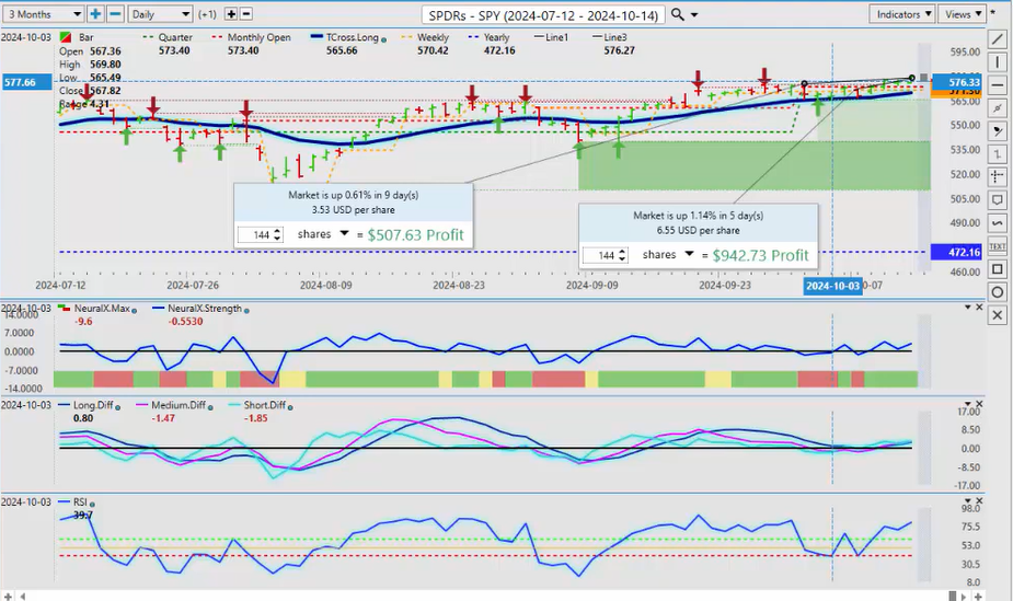 Now, how do the stock markets all play into this? Well, let’s have a look, first at the SPYs. First of all, we need accurate; the SPYs are barely positive here, guys, on the month. When we’re looking at monthly pricing, we always look at the start of the calendar month, not drag September into October and then muddy it up with a random 30 days, a random 5 days; no, we take very specific points of performance points, the start of the month; SPYs are only up 0.61% uh, this past week, we’re actually up 1.4%, so we’re outperforming on the week than what we are on the month, so it’s looking good here, uh, we still need to extend higher, but the indicators are set up good for an extended rally, but always remember in the market we’re in right now, the dollar down, just about everything else is up, uh, now the stocks, yes, they’re a little shaky up here because we’re still trying to get confirmation if we’re in a, again, hard landing, soft landing, what are we doing here, so the market will work through this and the addition of the retail sales coming next week and the ECB, uh, these will all factor in, uh, to the stock market but to help assist with that, our T cross long, that is at, on the SPYs, is 569, so we look to buy at, at or around that particular area, and always remember, the S&P 500 and the SPY is the same trade here, guys, so you can see that the S&P is extending higher; it’s turning positive now on the month, and again, this is why we use the current monthly opening price; we can’t pick random points and say it’s bullish or bearish in October; the only place to start is at the monthly opening, and then we can make that determination, so now we’ve closed above the monthly opening price multiple days in a row; our T cross long 57,145, so as long as we’re holding above these levels, we can extend higher, and the VP indicators are confirming that that’s the way we look at this, guys, but if I move this, uh, you know, and say, okay, over the last month, what is the performance, but I move the date over to here, then I can cherry-pick a bottom and say, oh no, no, the stocks are way up, but in actual fact, they’re not, so this is where we can gauge where exactly we are in the each and every calendar month and then we can apply seasonal patterns, intermarket correlations, all of these things come together for what we hope will be a great trade.