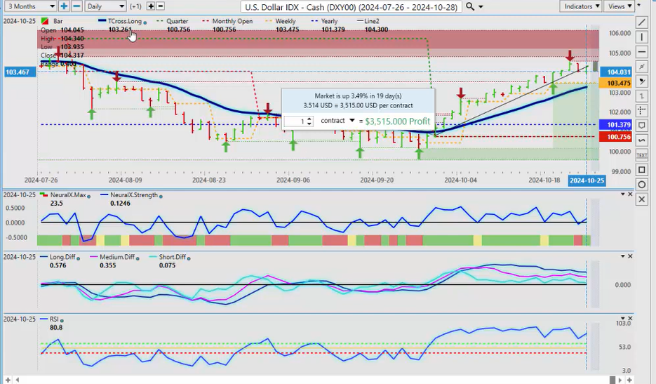 Now, we have the non-farm payroll number on, I believe, on Friday. It’s going to be volatile. We’ve got the US election, but after all of the dust settles, the Dollar is likely to move lower sooner rather than later. But again, this distortion often happens in election years. But again, the V.P. indicators are very mixed across the board, but the predicted differences are pointing lower. Again, we want to make sure we’re being cautious up here, but before and if the Dollar can rally any further, it would have to move above this very stiff resistance just below the 105 level.