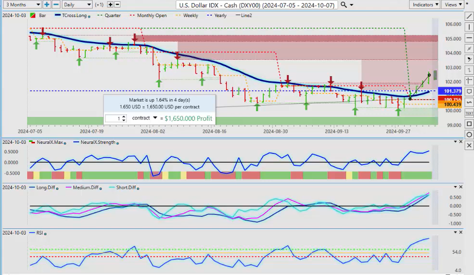 Now, to begin this week, we’ll start where we usually do with the very important US Dollar Index. Now, the dollar spiking higher on that unemployment numbers on Friday, but the data was still a little bit mixed, and we’re still missing about 900,000 jobs over the last year. But either way, it’s calmed down the expectations for a 50 basis point cut, not that the FED had ever said that to begin with. He had talked about 50 basis points by the year-end, which would mean 25 basis points in November and December, but the dollar has reacted positively to this. We are now up 1.64% in October. Now, very, very important that we’re using proper anchor points in our trading for the month, not a random 30, a random 5 days, or a random 30 days, because we need to know exactly where we’re sitting for the month of October. In most cases, between 1 and 2% is the max rise or drop for the dollar in the majority of cases. So right now, we have significant headwinds up here on the dollar anywhere above 102.50; we should be looking for a pullback. The VP indicators here are starting to peak, suggesting a turn could be coming. Now, in most cases, the week after the non-farm payroll number, whether it’s a good number or a bad number, the dollar usually starts to sell off, so all the gains are in there in the beginning of the month. And again, I would expect some sort of pullback. Now, again, I’ve been discussing the dollar strength at the beginning of October, the seasonal patterns, but they usually subside by mid-October. But the bigger seasonal pattern with the dollar is it’s usually structurally very weak after mid-October. So again, our retracement point is the T cross long at 101.28. We have turned back positive on the calendar year; 101.36 is the yearly opening price, meaning from January 1 to now, this is where we’re sitting. We’ve turned positive but very, very slightly.