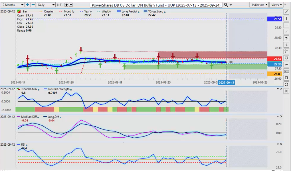 But for now, we can see that on the UUP, on the predicted RSI with a 60/40 split, it was showing some kind of momentum, but very quickly it recovered and moved back up inside the range of the 60/40 split.