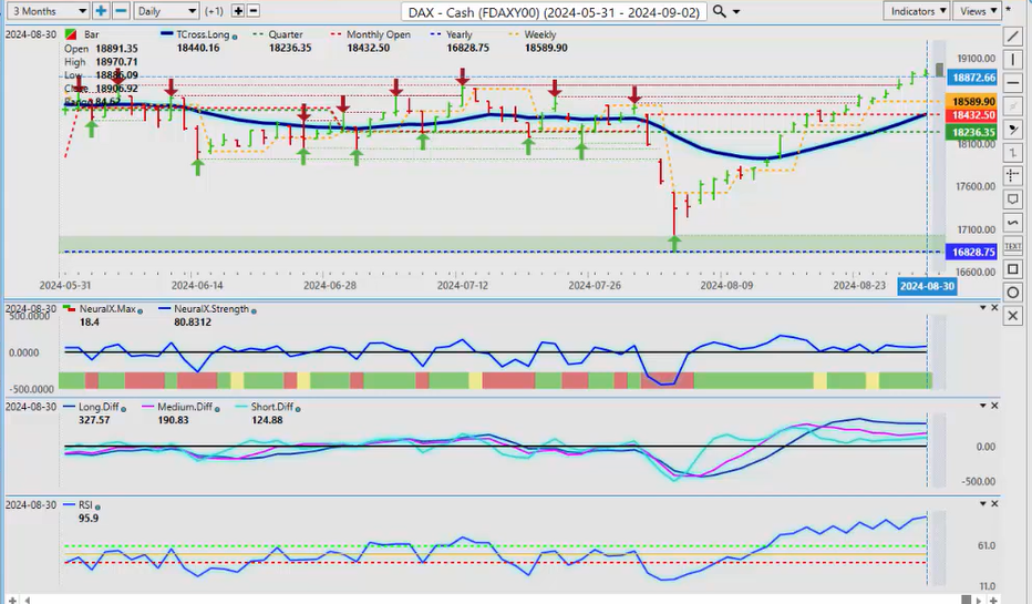 This Dollar cycle that I’ve talked about over the many years of doing these outlooks is there is predominant Dollar buying in the first week at the end of the month into the first week of the new month. Now, there’s also a very strong seasonal pattern of Dollar buying in the US fiscal fourth quarter, which will end October 1st. So, right now we can see that the Vantage Point indicators are clearly picking up on this: the predicted differences, the neural index, the neural index strength, and we’re gaining momentum on the predicted RSI at 60.2.