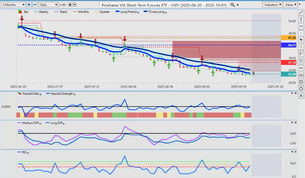 So, we definitely want to make sure we’re looking at that VIX to see if there’s any warning sign here that there could be a problem. And sure enough, there is—that reverse check mark on the predicted RSI. It’s starting to come back up. Our medium-term predicted difference is above our long-term predicted difference.