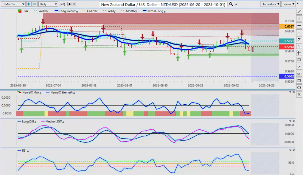 Now, the Kiwi—I’m not sure it can be quite as supportive as that. Uh, the market is interpreting that the, uh, the Bank of New Zealand is becoming ultra-dovish, and there’s going to be multiple, multiple cuts going forward, which may very well happen. But we saw how that worked out for them when they believed that about the Fed. And the media is really winding people up here. So be careful of that, too. But for now, the Kiwi is likely to move into the bottom end of these verified zones, down around 0.5818. I anticipate, at least at the first test, that that 0.5818—maybe a hair lower at 0.58. Uh, but I anticipate that area could hold at least for next week. But the market’s becoming very, very dovish on the Kiwi, and I’m not convinced that that’s what they should be doing going into year end, as the dollar—I would anticipate the dollar weakening, either way, into November and December. So, we, we do have another choppy, volatile week ahead, but with that—provided you know your levels—opportunity will come with that. So, with that said, this is the Vantage Point AI market outlook for the week of September the 22nd.