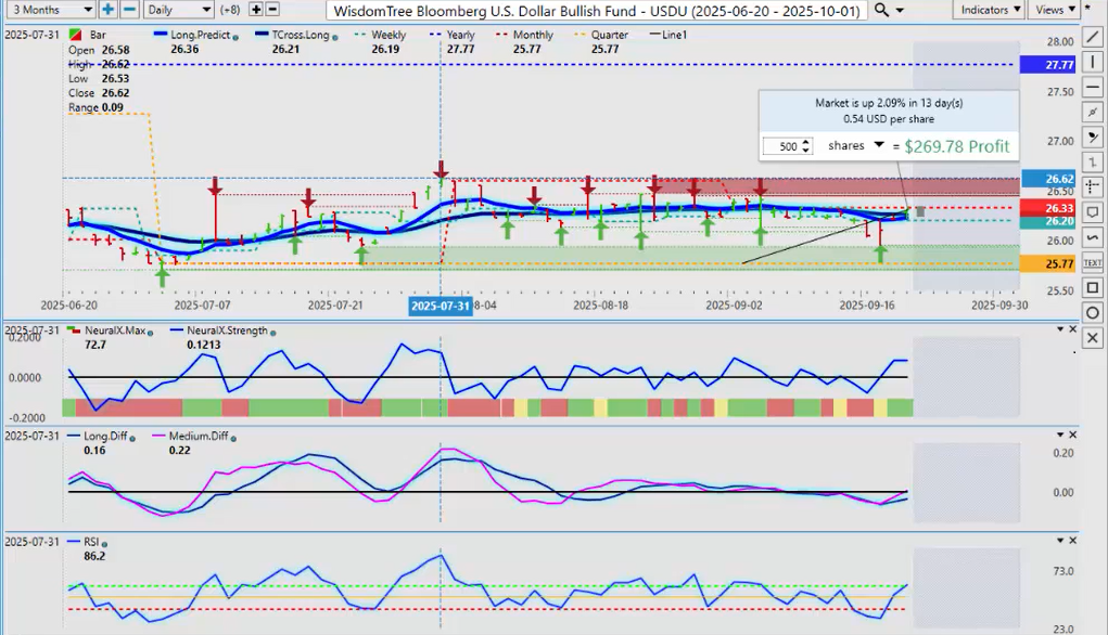 We do need to get above 2633. You can see that I am using the WisdomTree USDU. Now, if I look at the UUP, to be fair, you can see a very similar signal here. On either one of these two, they’re both showing the dollar is still in pretty good shape.