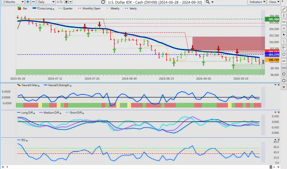 As for USD/JPY (Dollar/Yen), there are some changes happening with the current government, and that change could bring potential rate hikes into Japan. This is being discussed by the new leadership, so the interest rate differential is shifting. Either way, the USD/JPY pair is grossly overvalued, even at 142. If we can break down below 141.03, that will confirm that the carry trade is in trouble, and so is the dollar against the yen. I believe this will make for very good shorts in 2025 and going into the end of 2024. So watch for a breakdown of 141, but remember, if USD/JPY breaks down, all the Japan crosses will follow: EUR/JPY, CAD/JPY, AUD/JPY, etc., as the yen strengthens on potential rate hikes. VP is picking up on this with the MA diff cross and the neural index strength. This is currently showing downward momentum with the predicted RSI, but I believe we need to get through the payroll number first. If we can hold below our T cross long at about 143.55, we should see additional shorts building as they exit the carry trade.