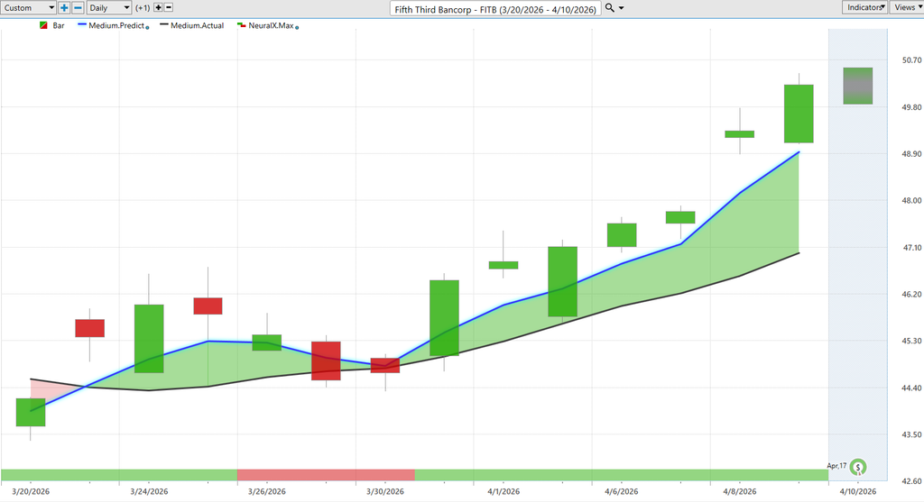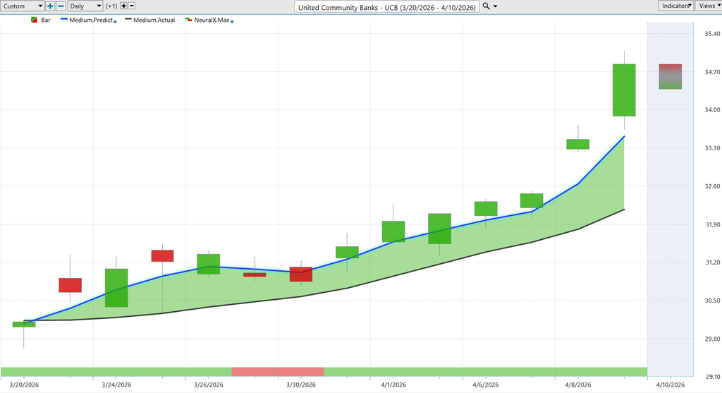 United Community Banks shows a very similar setup. You can hone in on the sector, identify the leaders, and then fine-tune entries using predicted highs and lows.