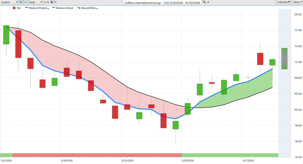 Colliers International Group provides another key example. The neural index is looking ahead 48 hours and has a very high level of accuracy, upwards of 86% to 87%, at forecasting direction.