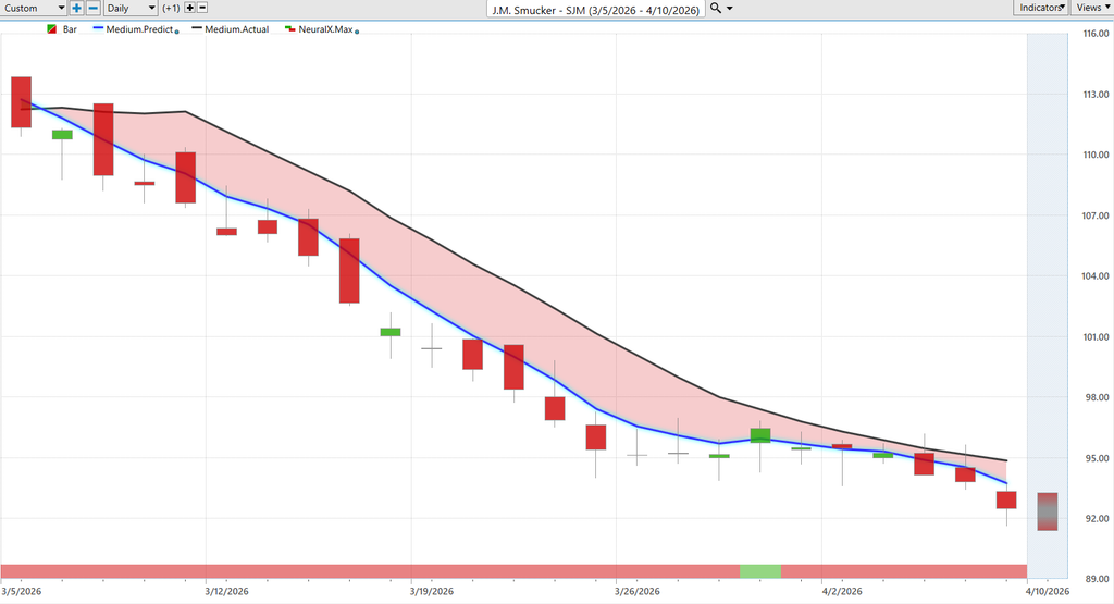 Now, there are still markets in downtrends. J.M. Smucker is a clear example. The blue line is below the black line, and the neural index is bearish.
