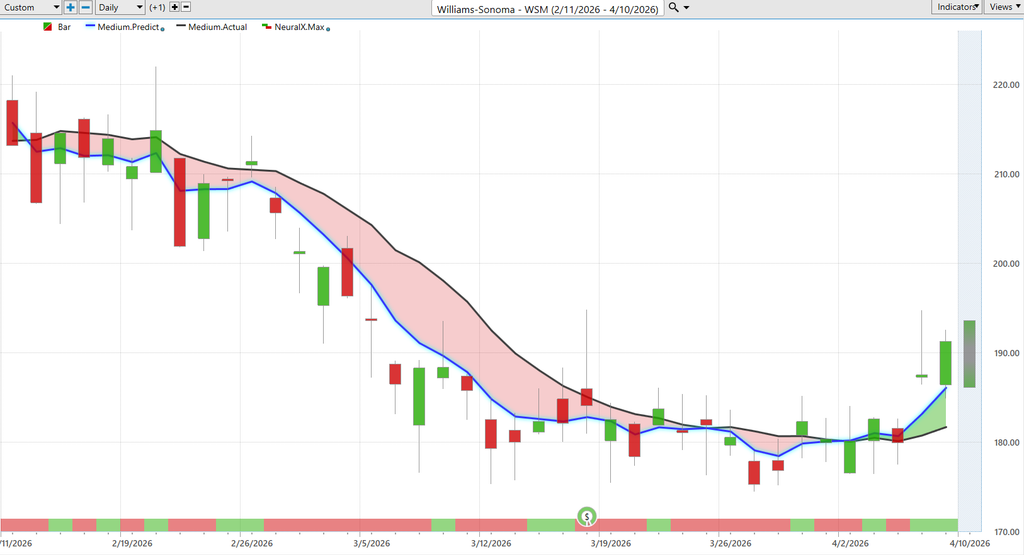 Finally, Williams-Sonoma highlights a transition phase. Initially weak, the stock begins to stabilize as the blue and black lines converge.
