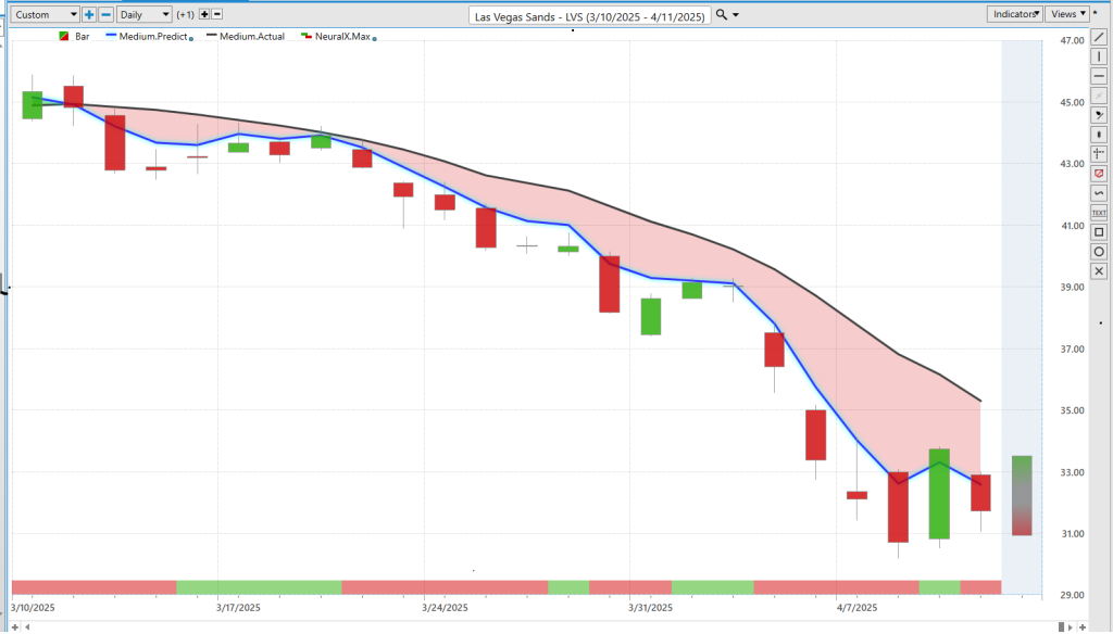 With **Las Vegas Sands**, shares are down about 29% since the forecast 23 trading days ago. This has already been in a downtrend and got weaker as recent news hit. At the bottom of the chart is a bar going from green to red, back to green—another neural-network-based indicator tuned to solve short-term (48-hour) strength or weakness.