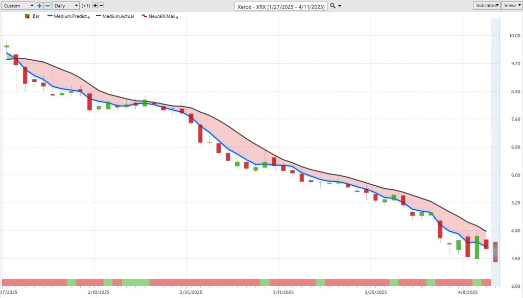 Another example: **Xerox ($XRX)**. You can spot weak conditions in weak markets to focus on the bearish side or hedge the portfolio. This forecast goes back to the beginning of February or end of January. The blue line crossed below the black line and the stock has dropped about 57% over the past 51 trading days.